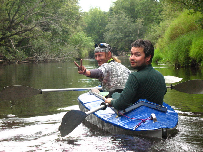, в смысле шкуры. Здесь вернулись командированные, и Саше Смирнову с женой Олей пришлось переворачивать шкуру самостоятельно, ибо мы с Сашей П(авлюченко) начали собирать наше плавсредство. Разве можно передать сухим русским языком всю бурю эмоций во время сборки этого шедевра российской инженерии. Видно, что байдарка побывала в знатных переплетах: шпингалетные защелки заменены трубками, перекошено в двух проекциях центральное крепление, шкура не по размеру или геометрии. Но кое-как кое-что получилось. Байдарка «Таймень» готова перенести наши тщедушные тушки в Кричев за три с половиной дня. Хо-Хо-Хо, Алексей определил, используя курвиметр, расстояние до конечной точки в 120 км – как оптимистично это звучало.