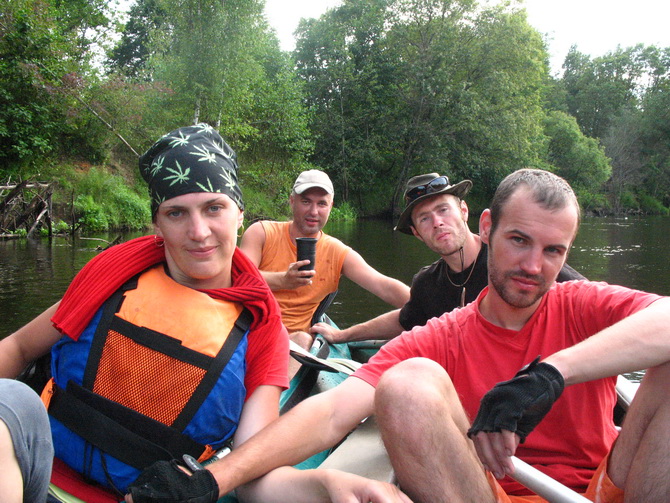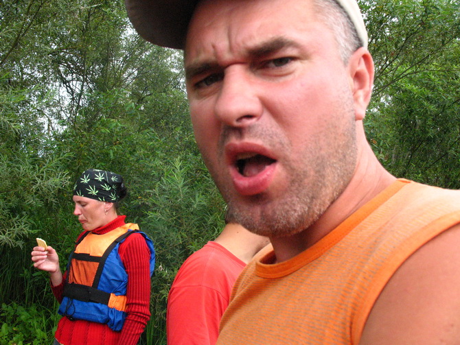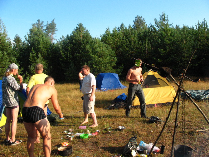 В течение дня, Таня гребла без энтузиазма, жалуясь то на больную руку, то на что-то там еще. Зато во время остановок шутила и нахваливала свои кумпяки и другие части тела. Встречались на пути и банки и незначительные перекаты, что делало и так занимательный путь разнообразней. После остановки на обед, у некоторых членов команды закрались сомнения в правильности рассчетов Глаза, ибо плывущий на встречу на моторной лодке Эдуард сообщил, что он прошел уже достаточное количество километров но все же оставался от нас достаточно далеко. Вторую половину пути было решено петь песни, после чего сил как-то прибавилось, особенно у Фрэнка. Андрей, являясь спортсменом, греб надежно и мощно, и в зависимости от желания Тани перемещался то в начало, то в конец каравана. В остальных группах отмечалась стабильность. Проплыв около 40-ка километров, достаточно утомленный коллектив начал искать место для стоянки. Первое достойное место было сразу же оккупировано 4-мя байдарками, но при выходе на берег, к сожалению для всех, была обнаружена группа местных жителей. Т.к. большая часть нашего коллектива мизантропы, сговорились не вступать в контакт и на вопросы отвечать односложно. Данная тактика сработала и аборигены, пожелав удачи, исчезли в направлении видневшейся деревни. Поставив лагерь и приготовив питание, начали споры по поводу расположения химических элементов в периодической системе Д.И Менделеева, и на многие другие темы, которые при определенной подборке коллектива всегда носят интеллектуальный характер. Сестры увели пьяного Глаза в палатку, кто-то ушел самовольно. В последствии, переключились на воспоминания из раннего постсоветского периода, назвав все это действо "ретро-вечеринкой". Заметившая в дали тучи Таня требовала, чтобы Стас натянул тент, но тот не желая прерывать беседу, проигнорировал ее просьбу, и заниматься этим пришлось Глазу среди ночи, когда пошел дождь.