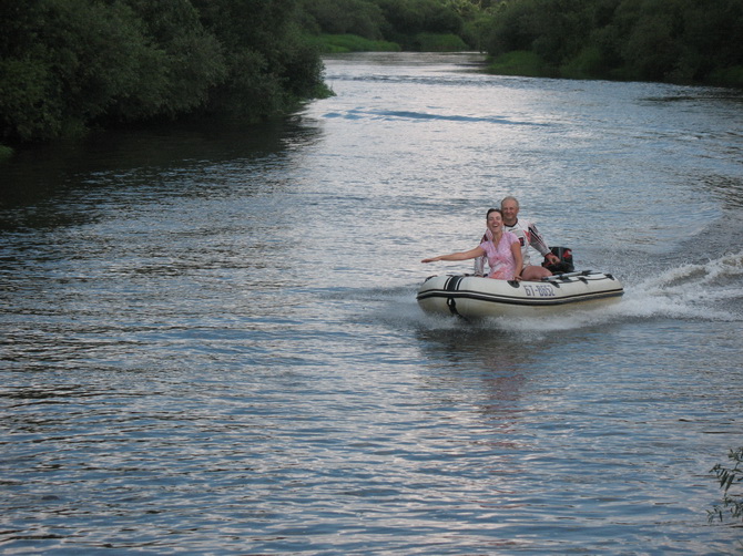 Вышли хорошо. Река еще чуть уширилась, стало больше живописных обрывчиков и дубрав. По прежнему было не скучно. Пахло бензином. Эпизодически Лимонов заводил мотор, Владимир сидел на носу и определял пригодна ли глубина. Повстречались отдыхающие. Они натянули поперек реки переметы, от них поводки с крючками. На крючке кузнечик. Один из рыбачивших продемонстрировал солидных голавлей. Я, Глаз, никогда так голавлей не ловил (как-то только на Днепре Лена (читай Глаз) поймала небольшого голавлика на фидер) и весьма заинтересовался. Переднему требовалось приподнять веслом перемет, чтобы дальше пролезть всей байдаркой. Поверх она не проходила. Унас был ремнабор, да и мы, как главная байдарочка, шли последними. Когда нагнали коллектив, обнаружили перегруппировку состава. Таня теперь ехала с Павлюченкой. Они с Андреем поругались. Предпоссылок к тому времени уже накопилось достаточно, последней каплей был вышеупомянутый перемет. Как именно события происходили, я не видел, но в итоге Андрей пальцем попался на крючок и наорал на Таню.