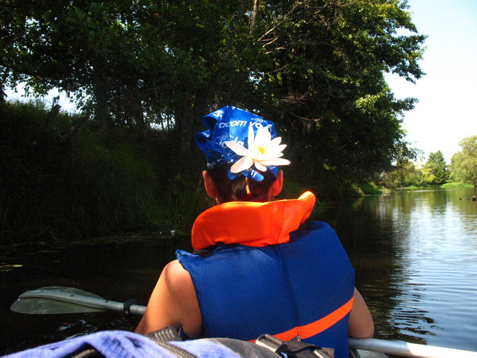 Лодки двойки ушли и сегодня вперед. Догнали мы только Неву ("Смотрите, вон Таню везут") и долгое время ехали вместе, иногда чалились борт о борт, чтобы немного подрейфовать. Остальные ушли дальше и прыгали в воду с обнаруженной на берегу тарзанки. Километров семь было скучно. Несколько расширившееся русло шло между пойменными берегами, поросшими аиром и тростниками. Местами под днищем проносились водные растения, казалось, что едешь, будто в аквариуме. Но вскоре опять пейзажи стали поинтереснее, тенистые с нависающими плетями хмеля, выступающими в реку лапами ив, с причудливыми завалами. Торчавшие из воды прутья на течениии колыхались, а наверху была, как правило, напрессованная метелка сена, оставшаяся еще с весеннего паводка.