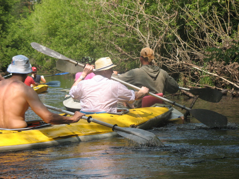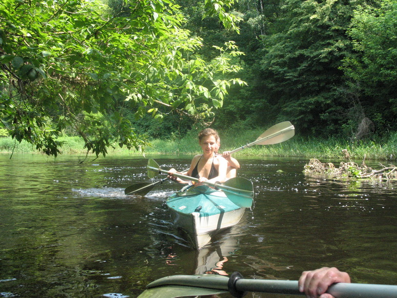 Берега Котры утопали в зелени. Вода, освещенная солнцем, пробивающимся сквозь древесные кроны, казалась матовой и с желтизной. Деревья порою смыкались, оставляя небольшой лишь проход-лазейку. Или требовалось нагнуться под нависающую ветку, а порою, даже откинуть плеть хмеля или оттолкнуть торчащую из воды корягу. Река была не самой удобной заниматься байдарочными тандемами и сплотками. Но мы сцеплялись друг с другом бортами, чтобы "поговорить".