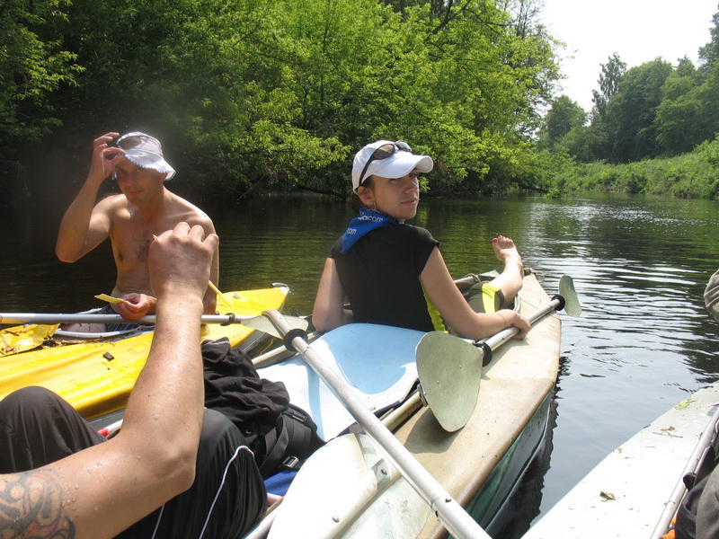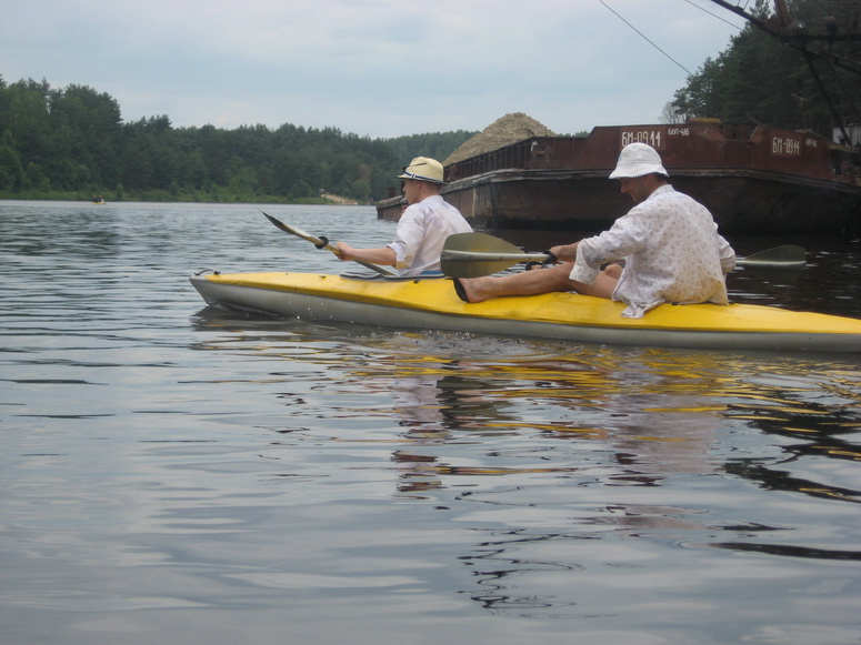 День выдался, что и говорить, знойный. В тени деревьев ехалось хорошо, безветренно и уютно. К тому же несколько раз окунались в воду. Лимонно-желтая байдарка неизвестной мне марки с экипажем из двух Дим - желтого и Ремонтника вела себя сразу особенно активно. Двигалась они по извилистой траектории, то вдруг круто разворачивалась почти на месте и немного даже против течения. Гребцы сгребались или задний поднатаскивал переднего.