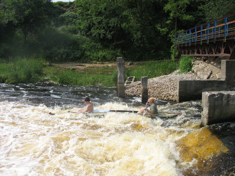 Согласно интернет-сведениям, плотина та должна быть сразу ниже устья Котры - деревня Комотово. Еще и ветер встречный подул. Карта лежала в моем рюкзаке, который невзначай приспособил в лодке Саши Большого (Крученка). Саша оппонировал и заранее, и в походе, что идея поехать на байдарках по Неману не самая лучшая, но невзначай поехал. Раз нет под рукой карты, можно у местных спросить, далеко ли до Немана. Как обычно, сведения, предоставленные респондентами, были противоречивые, сильно расходящиеся до порядка (от двух километров до двадцати)...