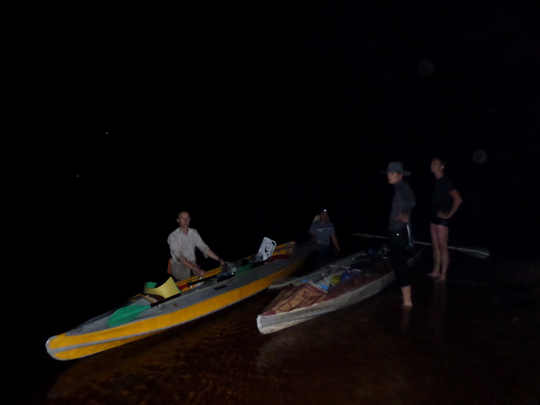 Полнолуние было сегодня как нельзя кстати. Луна поднялась выше деревьев и светила устрашающе величественно. Временами даже, когда она освещала участок русла вдоль, можно было тушить фонари. Эпизодически, где хватало глубины, ехали ощупью, совсем не быстро. Совершенно неожиданно прямо перед носом возникал то и дело уродливый силуэт коряги. Тогда можно было резко отвернуть. Или вдруг возникал частокол коряг. Тогда приходилось давать реверс и прицеливаться в проход, подводя байдарку через него самым малым ходом. Но чаще все-таки было нужно идти пешком и тянуть бечевой. Пустая мертвая безводная река была бесшумна. По берегам стояла гробовая тишина. Ни ветра, ни птиц, ни лягушек, ни кузнечиков. Лишь раздавались в темноте наши шаги, будто мы были тихонько крадущиеся браконьеры, под покровом ночи, отправившиеся за добычей, проверять только нам известно где поставленные сети.
