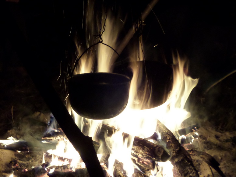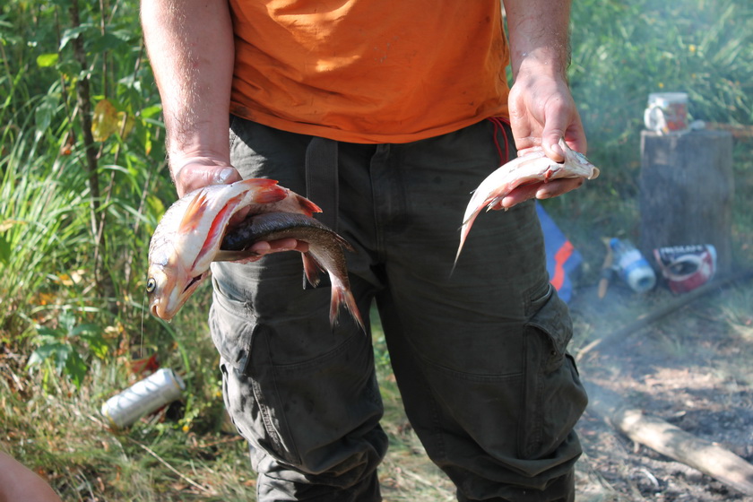 Поднялись не поздно, но с позиций туризма поздно. Бытовой сектор изловчились и словили язя и двух подлещиков. Рыба была тотчас очищена и пущена в уху.