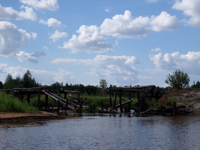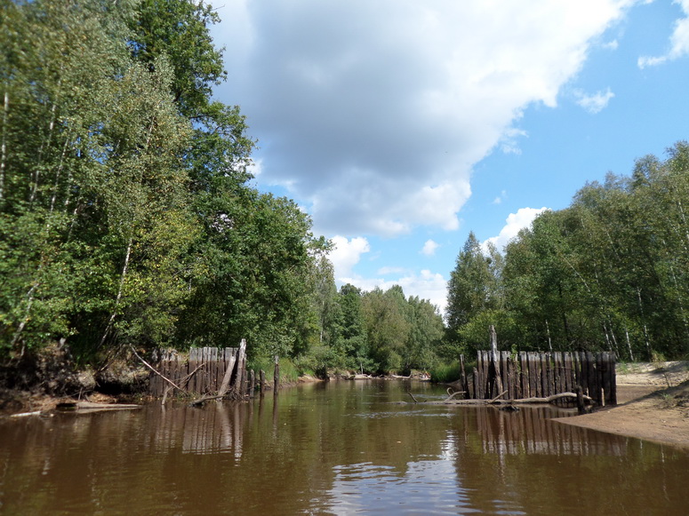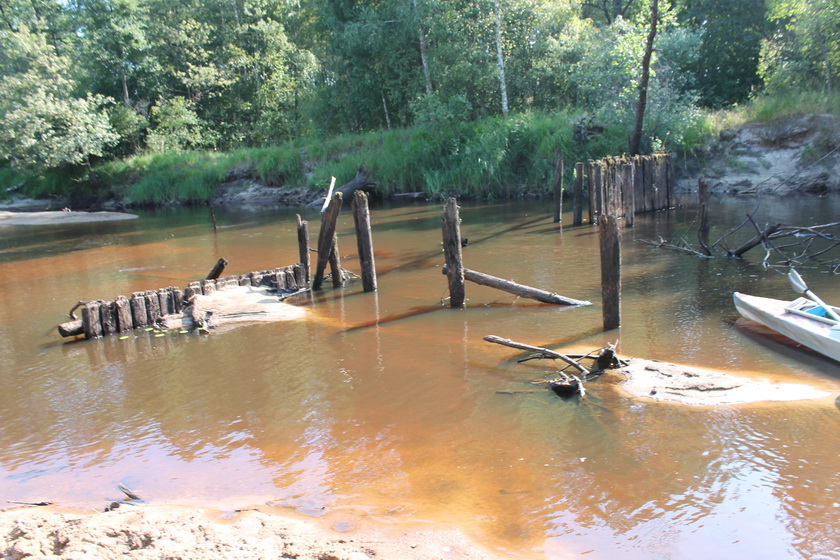 Река лучше не стала. Обыкновенно, чем ниже спускаешься, тем водоноснее русло – вбирает в себя дополнительную воду, принимает притоки. Но это не про Свигу. Тут, как в пустыне. Чем ниже, тем трафик воды меньше. Встречались умирающие мосты. Заколы для рыбы. Заколы для рыбы понравились Пузу. Далее всякие вертикально торчащие композиции коряг он комментировал: