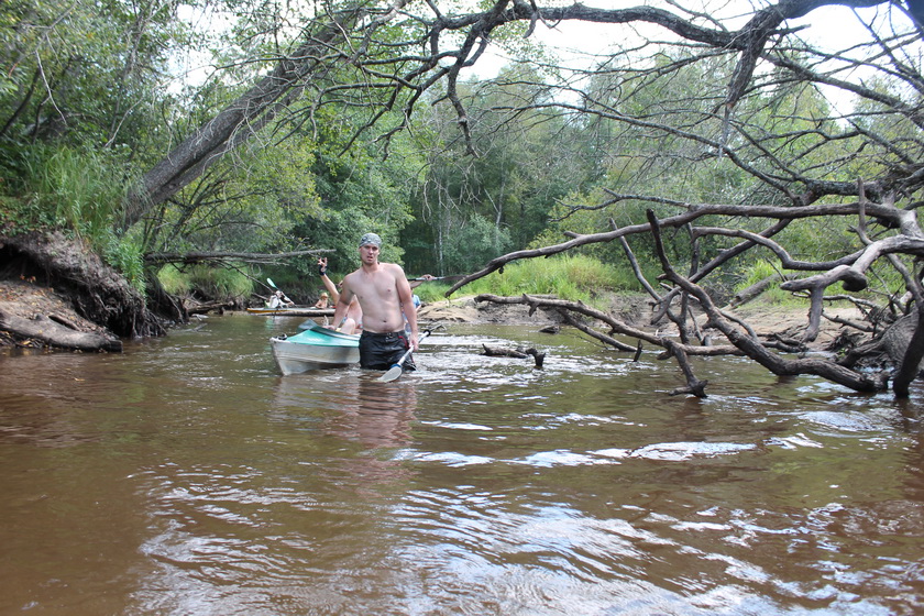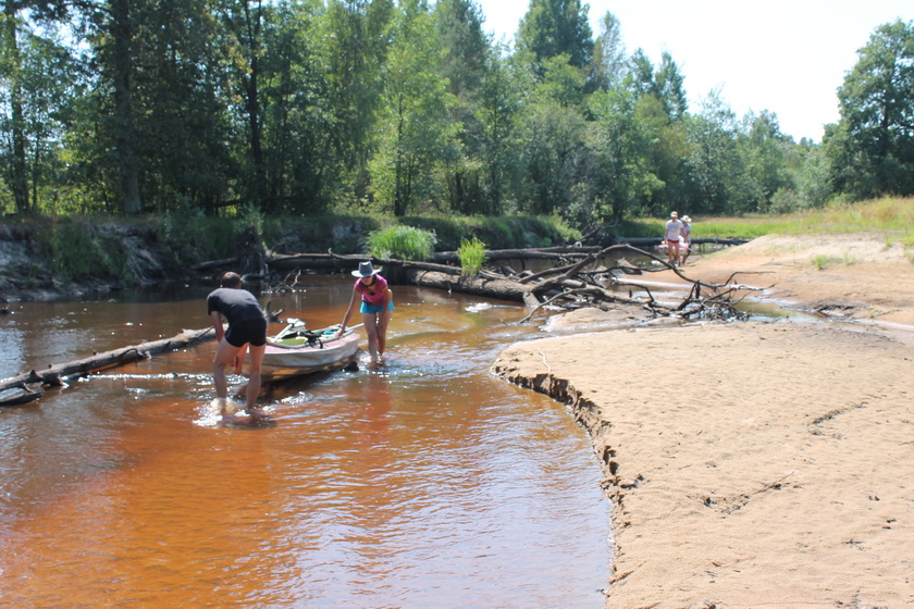 Вышли замыкающими. Река не то, что не улучшилась – воды стало еще меньше, чем было. Мелкий ручей тек среди унылых песчаных дюн или зло перекатывался из одной большой лужи в другую. По берегам непосредственно к воде подходил все тот же нескончаемый преимущественно лиственный лес. Всё то же обилие коряг, заваленных деревьев. Бесконечные перетаскивания, обносы, проводки, буксировка.