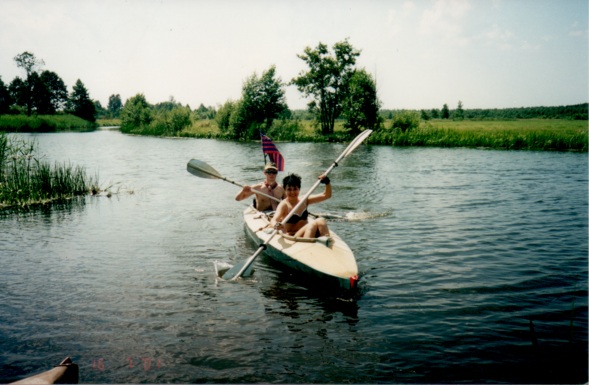 Выбрасывая сизый дым, к позднему утру, прибываем на место старта подле деревни Русаковичи, где нас уже ждут ещё два путешественника со своей байдаркой, вернее взятой у Соньки. Путешественники ожидали еще с вечера или с ночи. Лагерь их выглядел сиротливо в этом неуютном месте – голый открытый без претензии на пейзажистость выгон, палатка, затухший костер, несколько обгорелых веток, прямой непримечательный участок реки. В визуальной близости за рекой дома. Путешественники опричь унылым декорациям пребывали в наилучшем расположении духа. Были и провожающие – Миша Миндибеков и Сережа Мюцаг (тоже ночевали со вчерашнего). Первый за рулем, второй поддатый, но солидный.