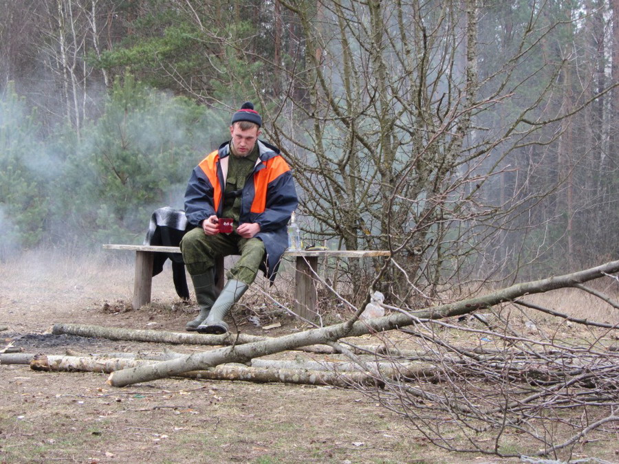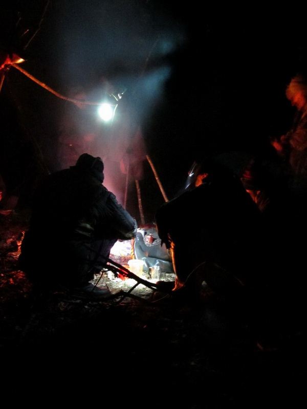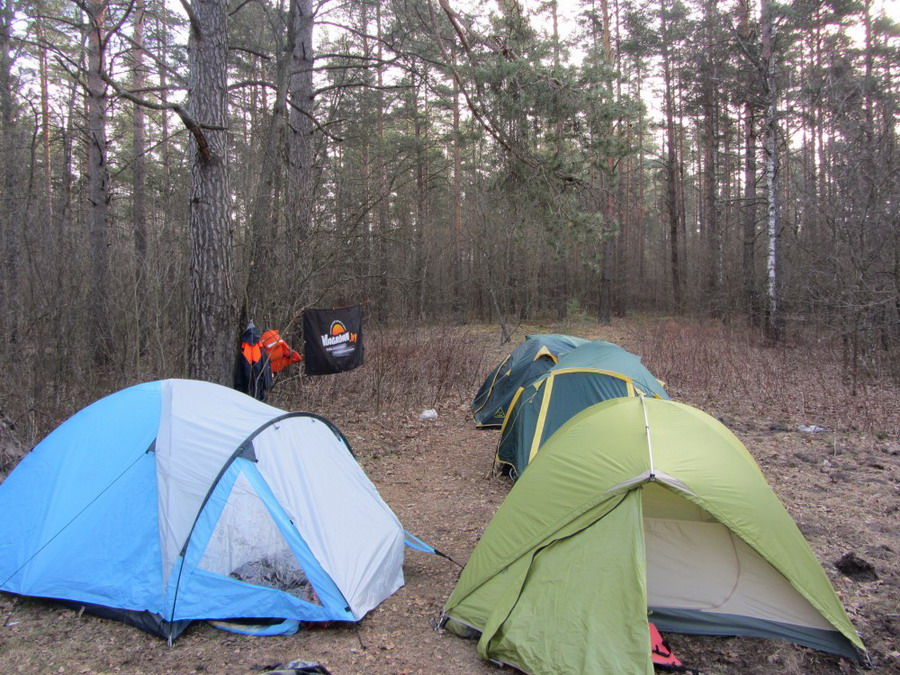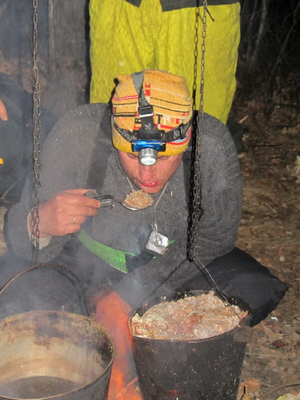 Оперативно соорудили костровое по типу турник-таганок, поставили котелки, запаслись топливом для костра и расставили палатки. Самый нетерпеливый Пузо даже тихонько кушал гречневую кашу, греясь у костра, «проверял готовность».