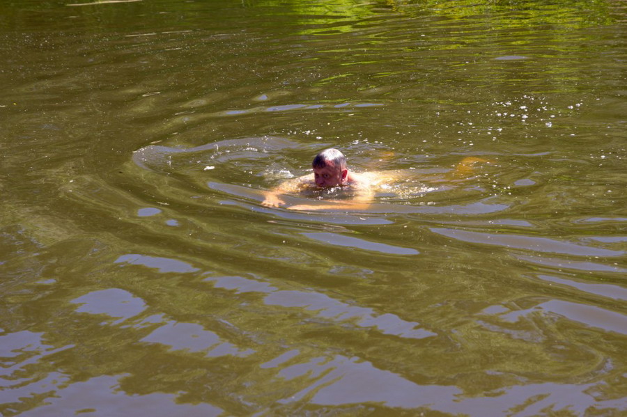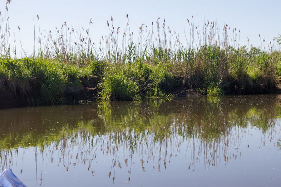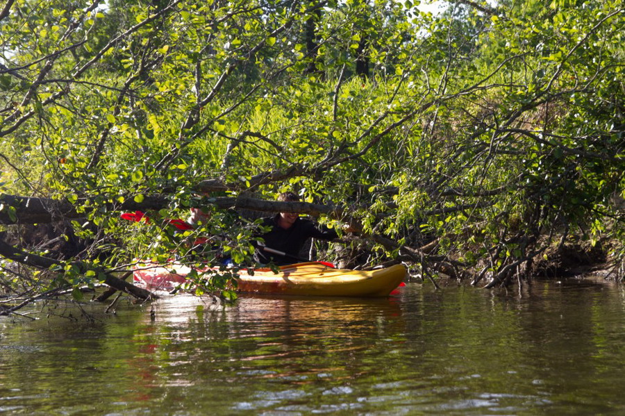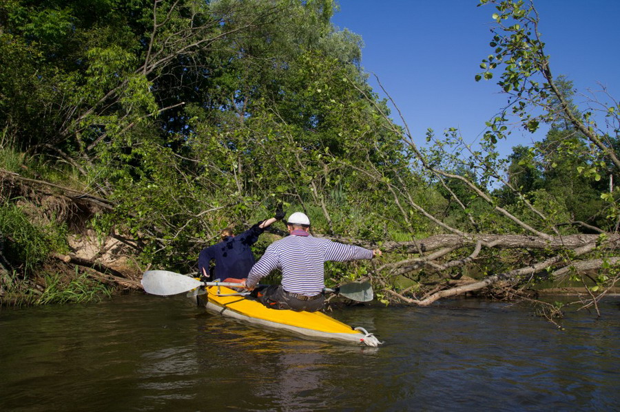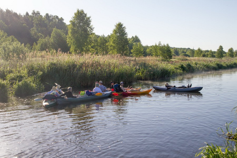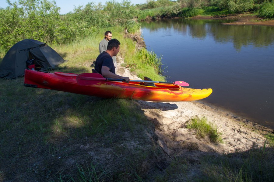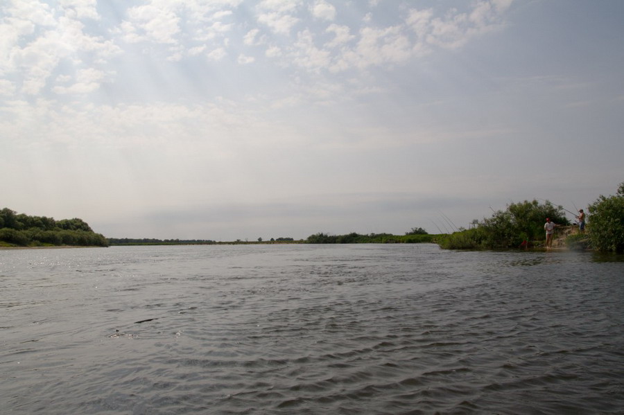 Течение здесь было намного быстрее. Приноровившись, удалось достичь крейсерской скорости — 10 км/час по навигатору. Из под форштевня байдарки веером расходился широкий бурун. Излучины были гораздо больших радиусов, чем на Случи, но в значительно меньшем количестве, что ещё более ускоряло наше движение — до этого много времени расходовалось на маневрирование. То тут, то там попадались рыбаки и простые отдыхающие.