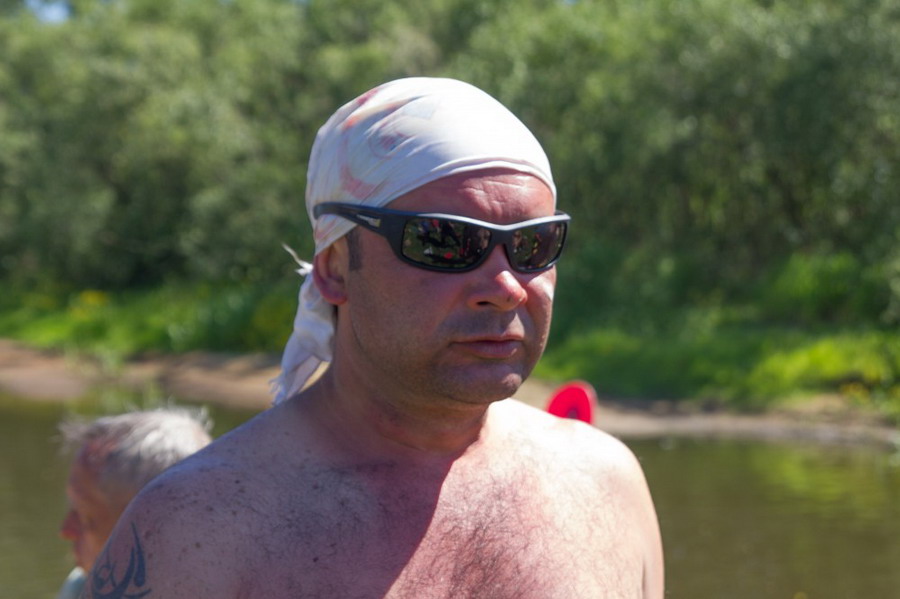 После ночи в бусе и гребного тренажёра «Kettler» спали в своё удовольствие. Как только стало припекать, все потихоньку перебрались в прохладный тенёк за стол. Руся с Волейболисткой так и не объявились. Подошёл проспавшийся Сантик и, видимо передумав посвящать меня в клан Левчуков, забрал Бабушкину Шляпу. Но зато через несколько минут за столом появился самый настоящий пират. Он высоко поднимал бокал и тепло напутствовал всех присутствовавших на покорение речных просторов, усмехаясь в густые мулявинские усы. Растрогавшийся Полковник Малышев сказал, что ему очень нравится в водном походе и заодно пригласил всех собравшихся на Эльбрус. А Глаз, наоборот, загнался и стал говорить, что походы по Беларуси — х...я, и нужно ходить в дальние.