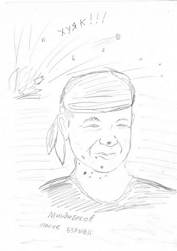 Спокойствие и размеренность утра нарушил громких хлопок со стороны костра. Все обернулись на звук. Возле костра стоял офигевший Миндибеков, весь в пластмассе и быстро-быстро моргал глазами.