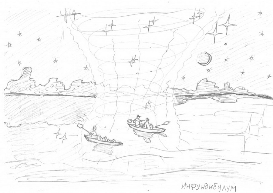 Мы точно знаем, что в одно такое место можно попасть где-то на реке Случь. Мы это знаем потому, что две байдарки - «Скрипучий голландец» и «Волейболистка Петрова», угодили прямо в него. Ты, наверное, подумал, что было бы неплохо попасть в хроно-синкластический инфундибулум и увидеть все многочисленные возможности быть абсолютно правым, но, к сожалению, это очень опасно. Этих несчастных вместе с лодками раздробило и рассеяло вдаль и вширь - не только в пространстве, но и во времени...
