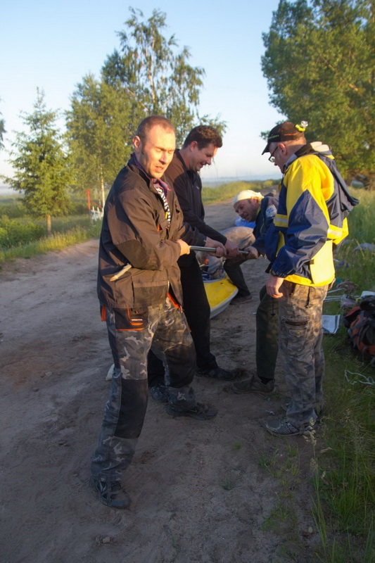 Часть бригады уже спустилась на воду. Особенно ярко собирали байдарку команда Павла Глазкова (Интерн Владлен и Игорь Пузо). Игорь поддал и толку было мало, да байдарка была старая и плохо собиралась. Однако гораздо ужаснее собиралась Свирь 2Н. При хорошем ходе и прочих мореходных качествах было очевидно, что это «трудный ребенок».