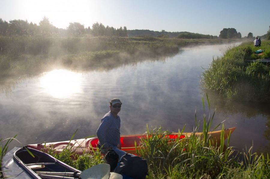 Приехали на место еще в темноте, выгрузили байдарки и вещи. Отпустили автобус. Остановились на проселочной дороге , которая шла параллельно реке. От канализованной реки дорогу эту отделяла здесь лишь небольшая полоска зелени. Трава была мокрая, вся в росе и на берегу было сыровато, поэтому народ и тусовался на дороге.