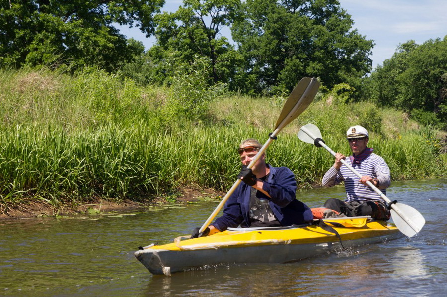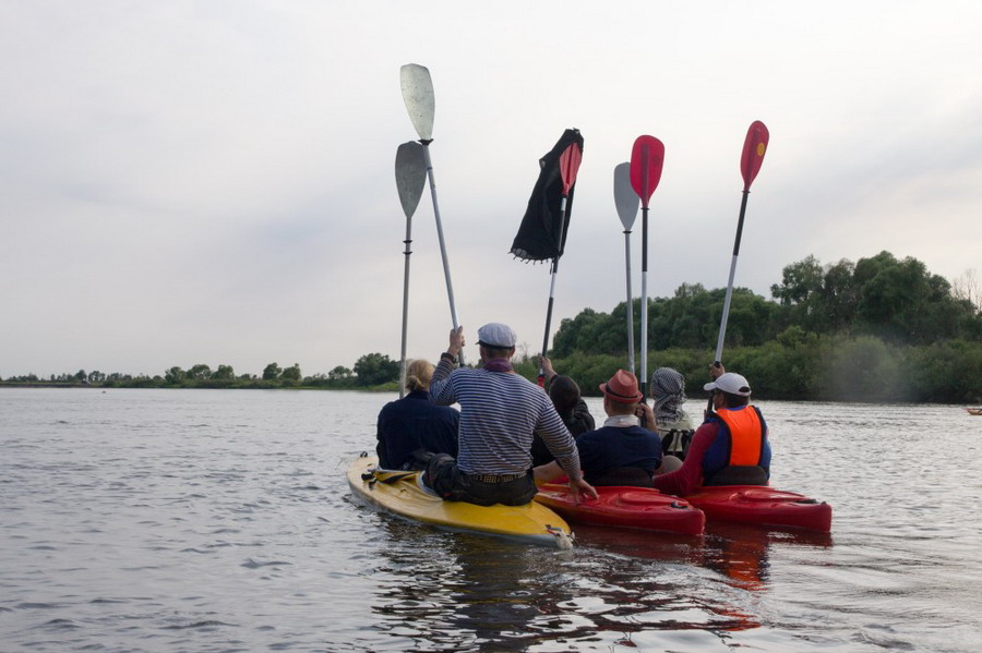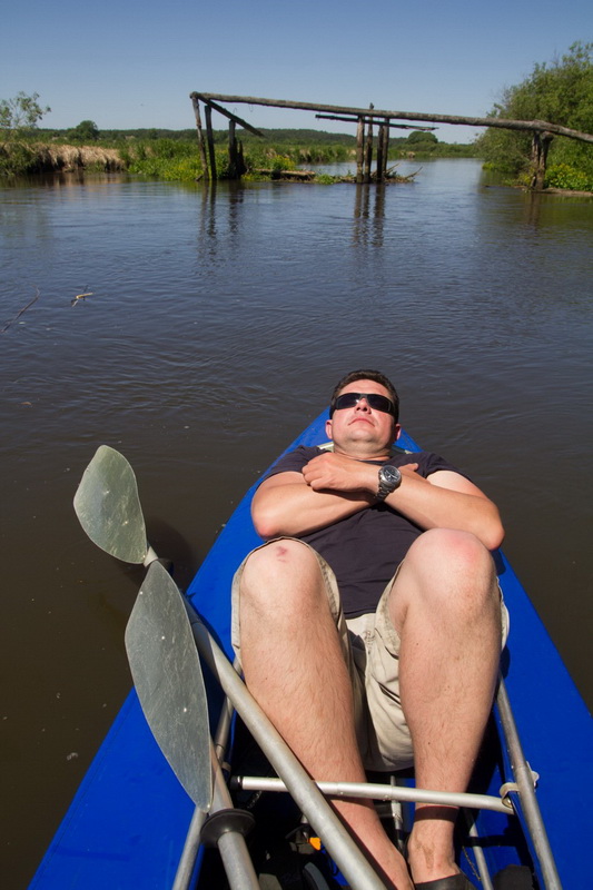 Первые часы шлось тяжело. Глаз подгонял всех, и матерно выражался. Задница у меня ужасно затекла. За 3 дня в байдарке начал превращаться в отбивную. Наконец-то с Серегой мы вошли в резонанс в управлении байдой. Был момент народ парконулся поесть и выпить и тут налетел Глаз и начал разгонять нашу мини «сиесту». Мы с Серегой прыгнули в байду и поехали догонять остальных. Шли по Случи… И вот долгожданная Припять. Да она оказалась очень широкой. Флотилия шла практически вместе, все находились в пределах видимости, кроме байдарки Сантехника. По Припяти шлось скучно, но быстро. Когда идешь поодаль берегов течение и ход лодки совершенно не ощущаются. Причем ветер был хоть не сильным, но все же попутным. Несколько лодок сошлись в сплотку и для парусности подняли весла. На берегах то тут то там множество отдыхающих и рыбаков. Очень хорошо шла тройка Паши Глазкова (+ Пузо и Вова). Не отставала «двушка» Ивана Моисеева с женой. У Русиянова от пары гребков его Хатанга просто летела.