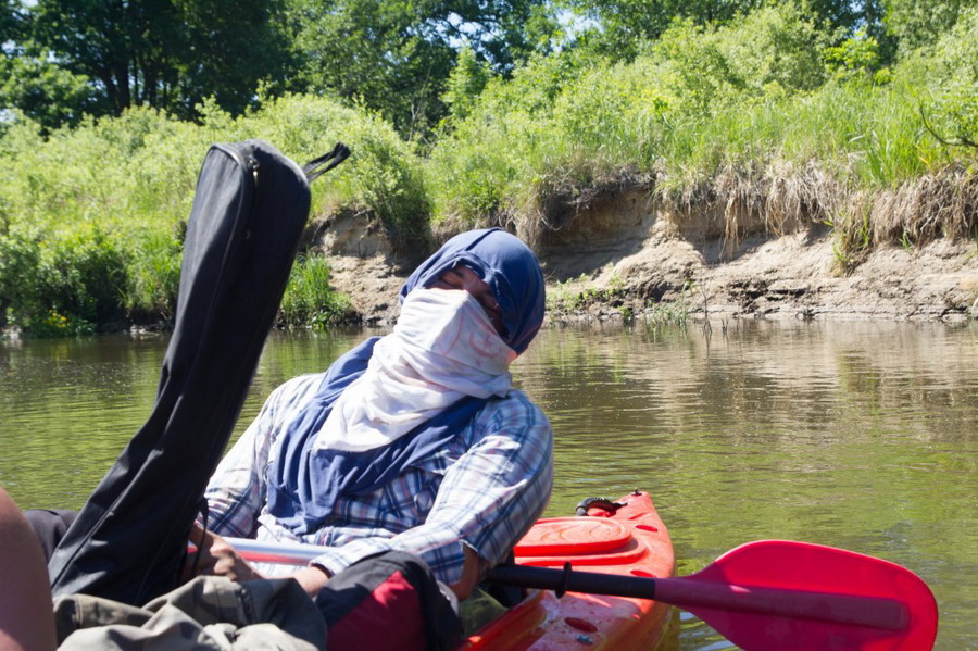 Мы с Сергеем выехали по раньше т.к. наша скорость передвижения по реке оставляла желать лучшего. Вскоре появился и Руся с Вероникой. Шли ни шатко ни валко. Мы с Сергеем гребли вдвоем в полную силу и не как не могли сравниться с байдой Руси, Вероника сидела спереди а Андрей потиху работал веслами и мы не могли с ним сравниться. Сразу видно где новичек, а где бывалый водник. Вскоре наша байдарка пристала к берегу, где стояла байда Руси. Ну и короче устроили свою «сиесту». Валялись на ковриках выпивали и травили байки. Я даже поспал минут 30, этот отдых потом