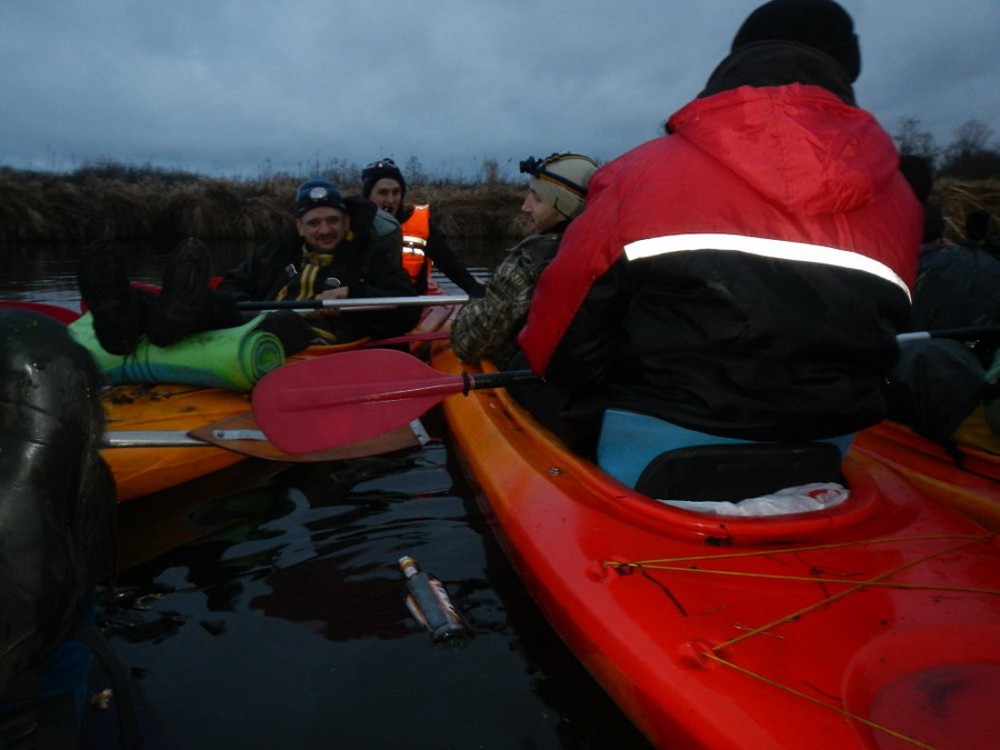 Слишком очевидно, что идти придется и в темное время суток. Река визуально стала шире и полноводнее, но петляла такими же огромными полукольцами. Когда окончательно стемнело, стал различим Борисов своим светящимся ореолом, так же начал отчетливо виднеться мост снабженный огнями. Полукольца реки вращали нас со всех сторон относительно двух объектов, движение представляло из себя чередующиеся петли по лабиринту. Фонари освещали воду. Было уже в нашей поездке что-то другое, не только унылое, но и обвораживающее, а может даже мистическое. Слышимость ночью на реке при безветрии казалась изумительная. Встречаясь с байдарками Глаза и Жлобина мы услышали гному (только за её лексическую реализацию по новым правилам Глаза будет нужно штрафовать), командир ругался на Женю, который был истощен гипогликемией.
