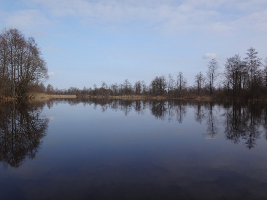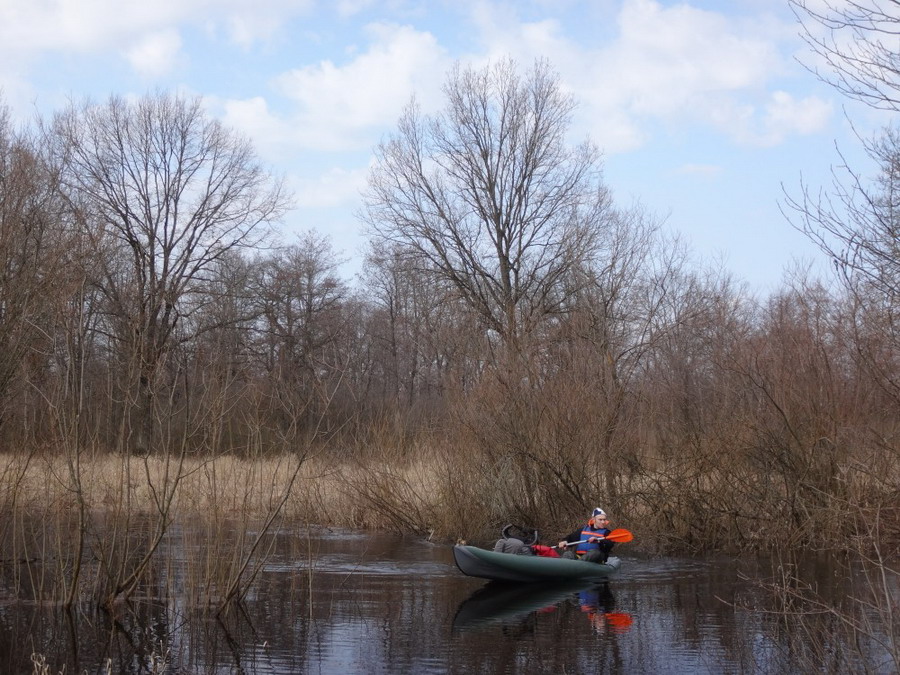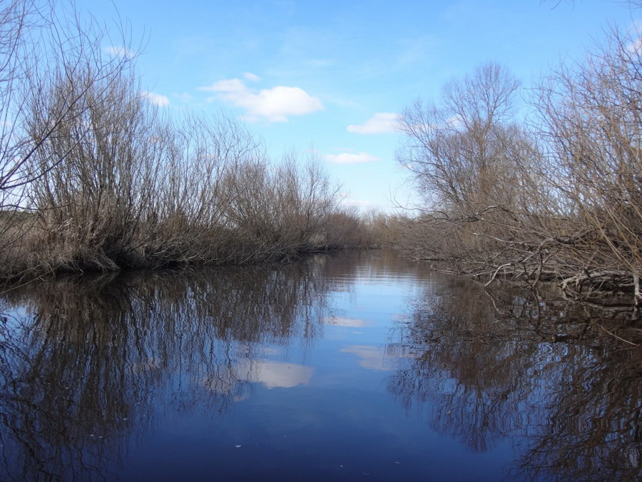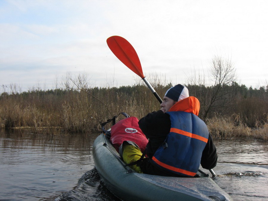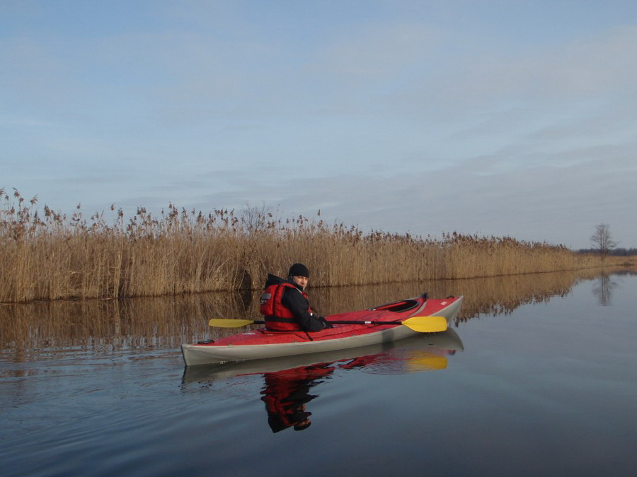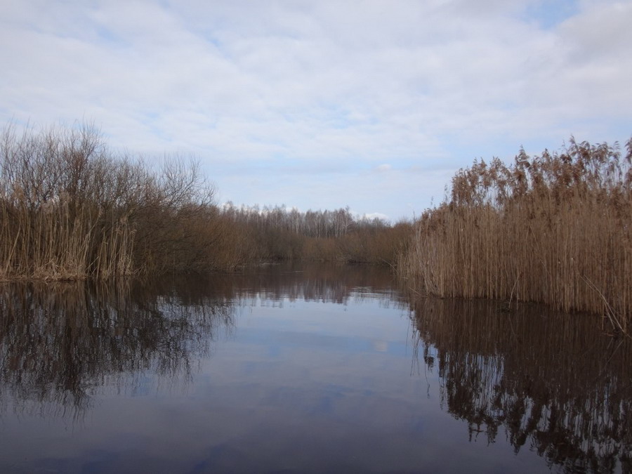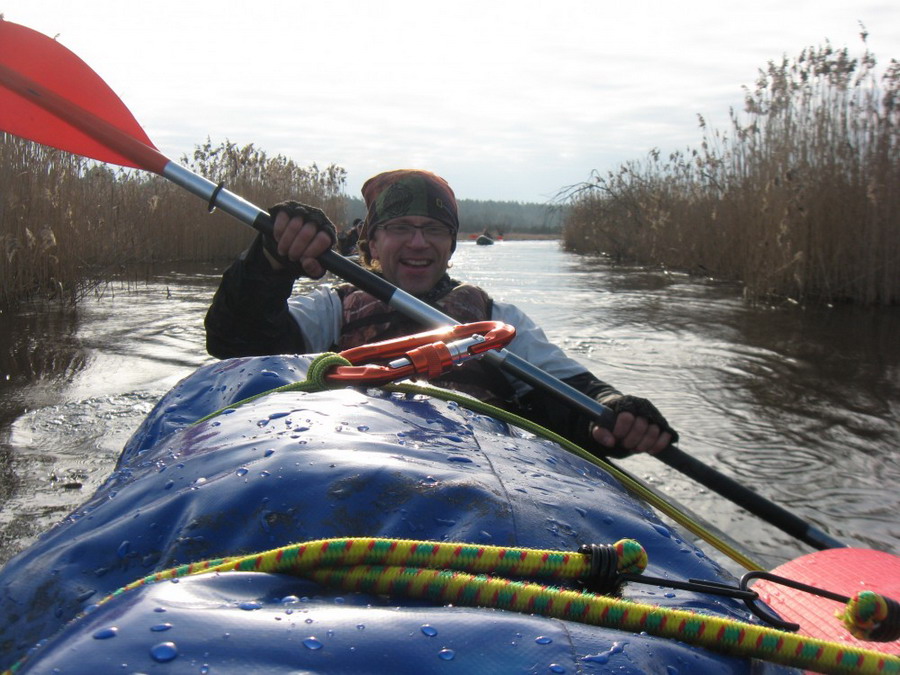 Прекрасен был первый из шести сегментов нашего сравнительно замысловатого водного маршрута. Солнце сияло, подернутое легкой ризой. Не слепило нещадно, зато согревало, что можно ехать было в одном только свитере. Некоторые участки скрытые растительностью были с полным штилем. И тут вода была ровным зеркалом, его возмущали лишь наши байдарки. Широкие плесы среди тростника и заболоченного леса чередовались с локальными сужениями в несколько метров. Шли в пределах видимости друг друга, хорошо шли. Впереди идущие двигались поступательно и казалось, что очень лениво и степенно взмахивают веслами. Но при этом методично.