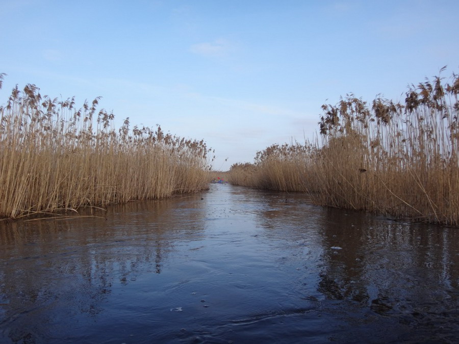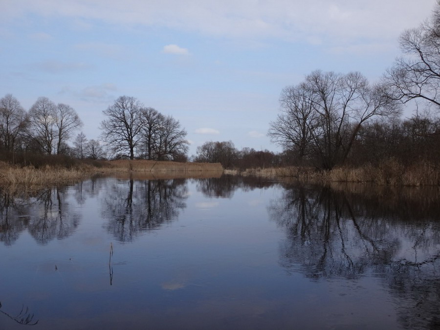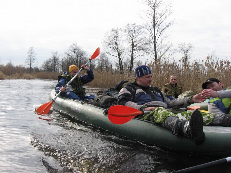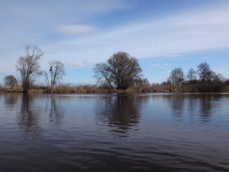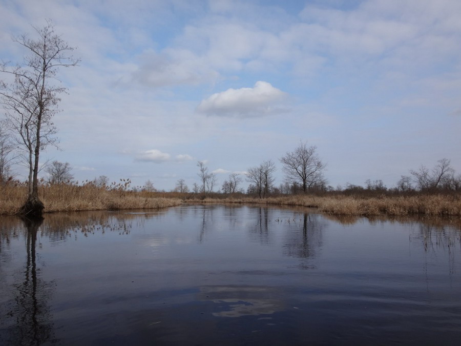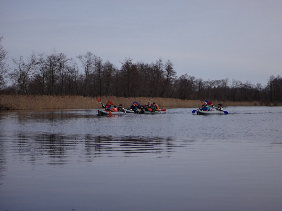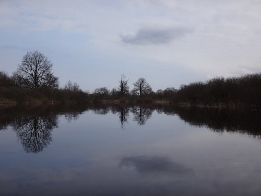 Прекрасен был первый из шести сегментов нашего сравнительно замысловатого водного маршрута. Солнце сияло, подернутое легкой ризой. Не слепило нещадно, зато согревало, что можно ехать было в одном только свитере. Некоторые участки скрытые растительностью были с полным штилем. И тут вода была ровным зеркалом, его возмущали лишь наши байдарки. Широкие плесы среди тростника и заболоченного леса чередовались с локальными сужениями в несколько метров. Шли в пределах видимости друг друга, хорошо шли. Впереди идущие двигались поступательно и казалось, что очень лениво и степенно взмахивают веслами. Но при этом методично.