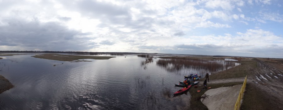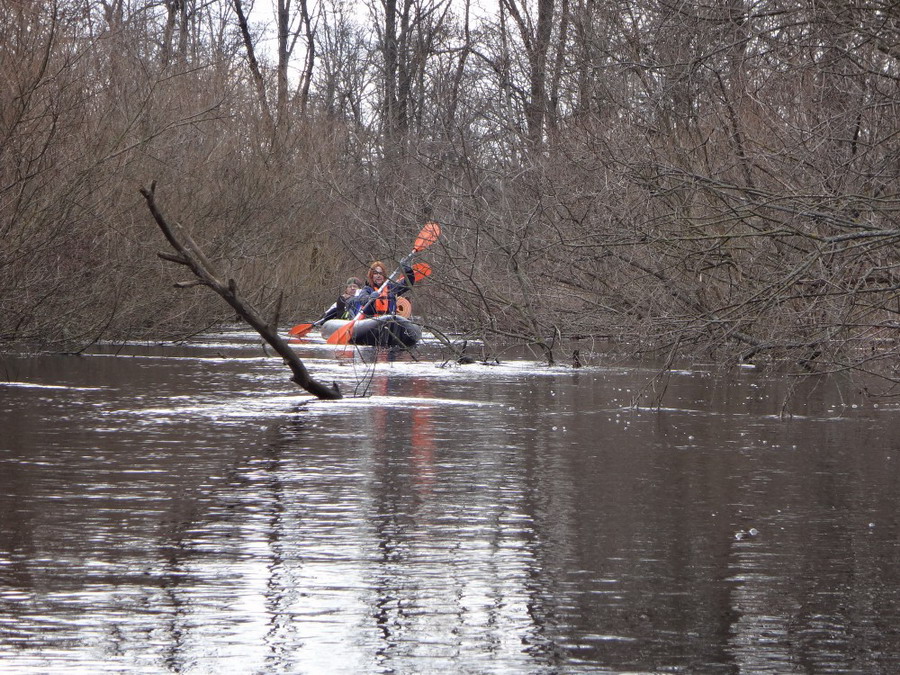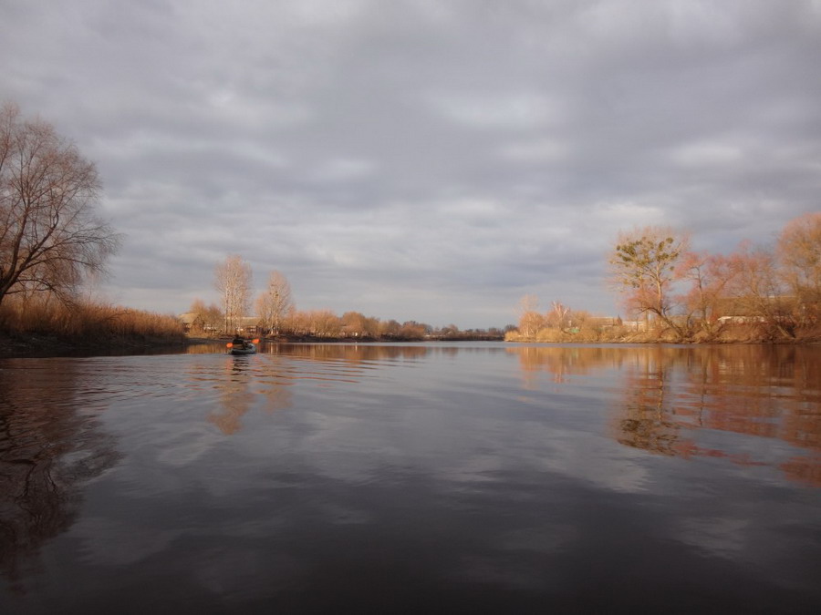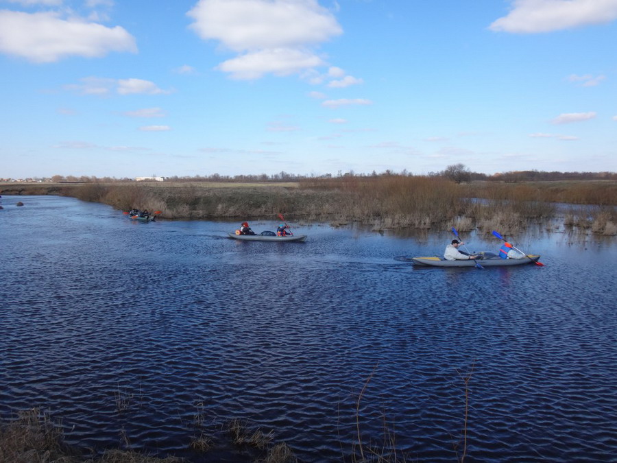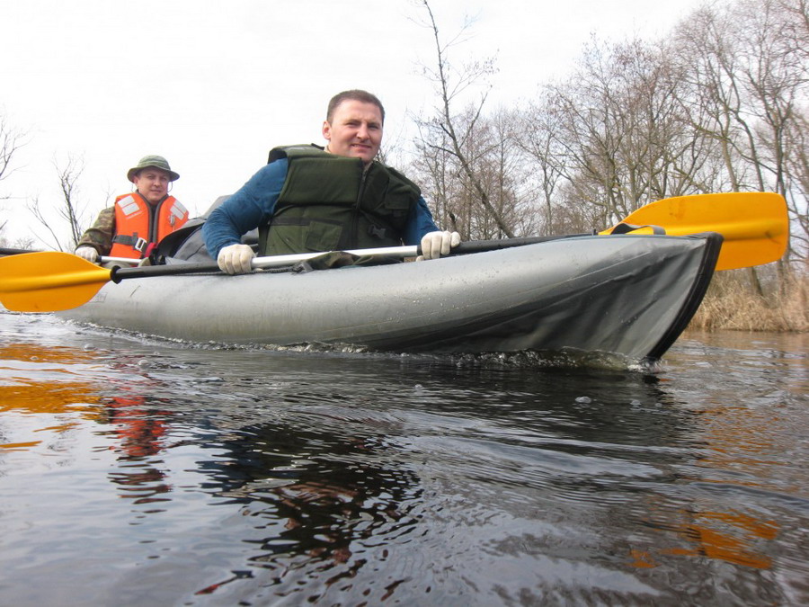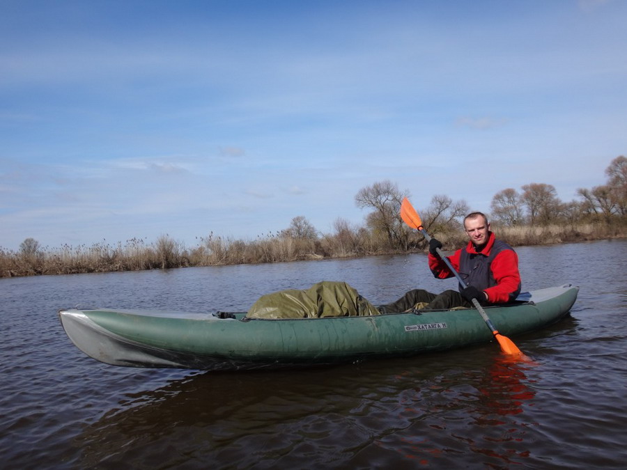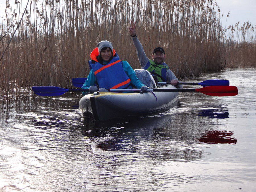 Прекрасен был первый из шести сегментов нашего сравнительно замысловатого водного маршрута. Солнце сияло, подернутое легкой ризой. Не слепило нещадно, зато согревало, что можно ехать было в одном только свитере. Некоторые участки скрытые растительностью были с полным штилем. И тут вода была ровным зеркалом, его возмущали лишь наши байдарки. Широкие плесы среди тростника и заболоченного леса чередовались с локальными сужениями в несколько метров. Шли в пределах видимости друг друга, хорошо шли. Впереди идущие двигались поступательно и казалось, что очень лениво и степенно взмахивают веслами. Но при этом методично.