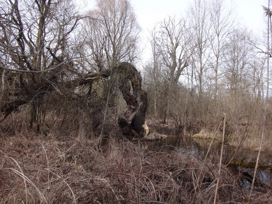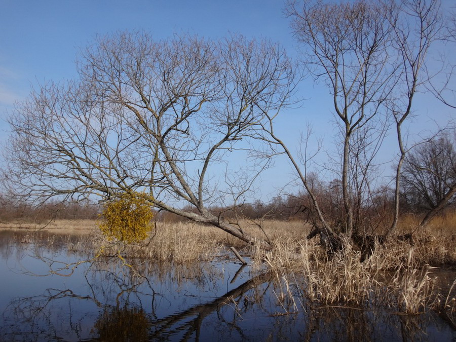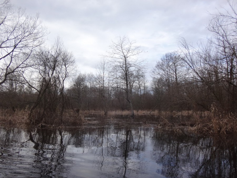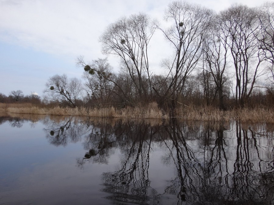 Без листвы на вербах вечнозеленые шары паразита омелы выглядели особенно причудливо. Льва уходила направо более широким руслом, чтобы вскоре окончательно потеряться среди обширного труднопроходимого болота. Нам же (по крайней мере в этом походе) налево. Лисовая Речка отходила на северо-запад более узким ответвлением. Два часа и кстати с течением бежали мы по этому сезонному анастомозу среди могучего сухостоя болотной растительности. Стоящие в воде деревья тянули к нам поперек русла свои корявые щупальце.