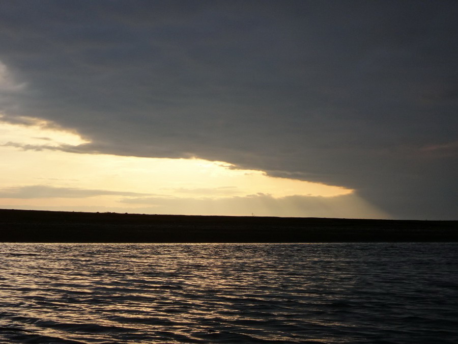 По мере сгущения сумерек облачность спрессовалось в единый слоистый фронт с четкой границей. Широкой узурой он простирался прямо над нами и немного впереди. Лучи вечернего солнца в виде светящегося снопа выглядывали из-за этого причудливого и дугообразного края.