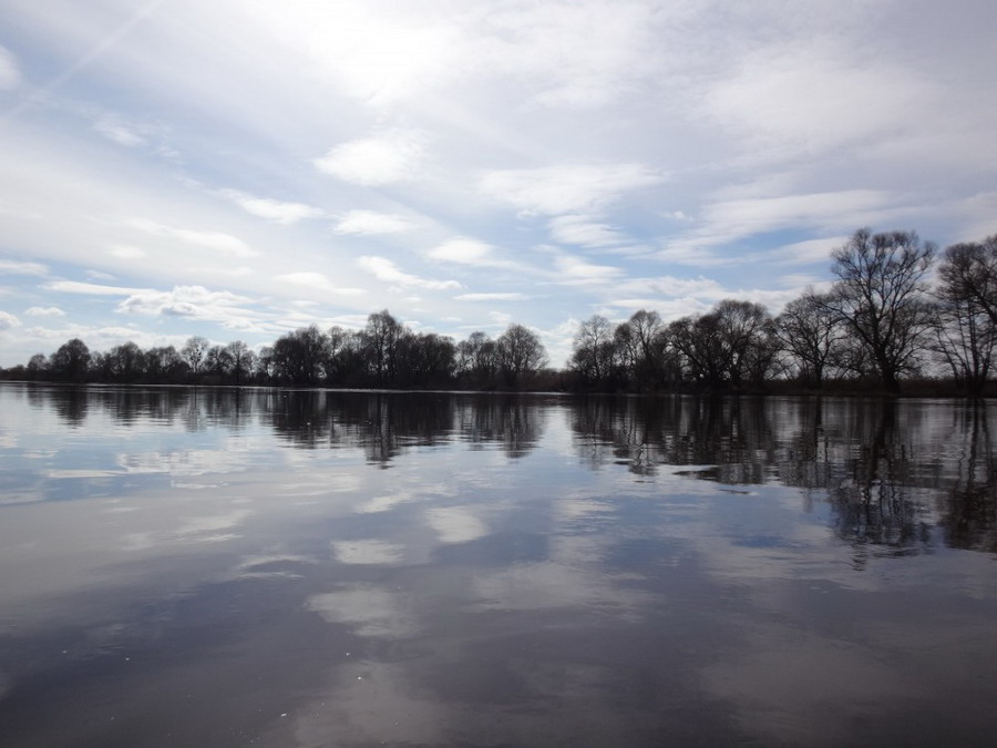 По навигатору русло Припяти морщилось в гармошку. Глаз изобрел маневр – срезать по затопленной пойме. Маневр удался. Мы шли по штилевой поверхности между стоящих в воде кустов. В ней зеркально отражались лодки с седящими в них гребцами.