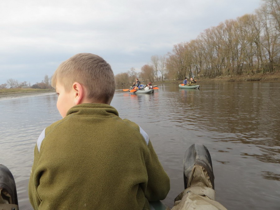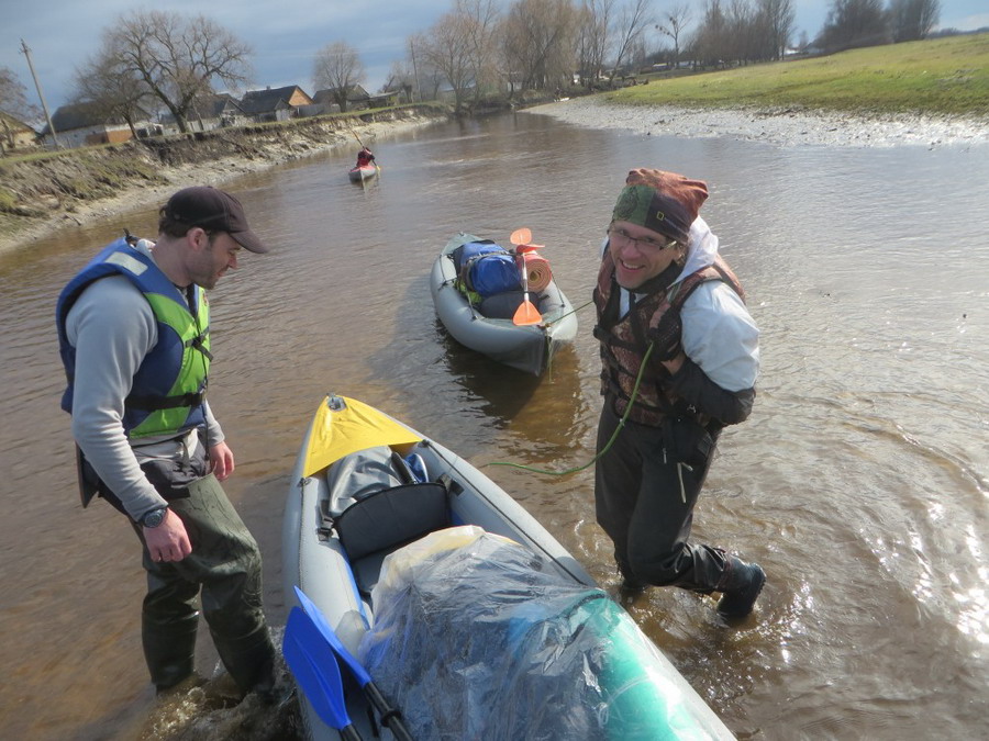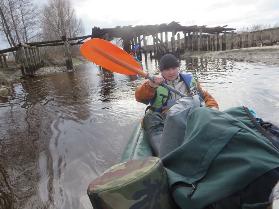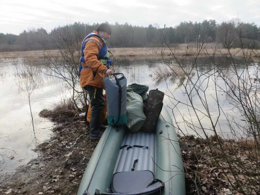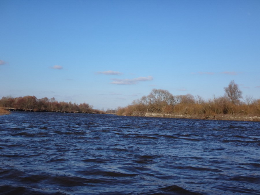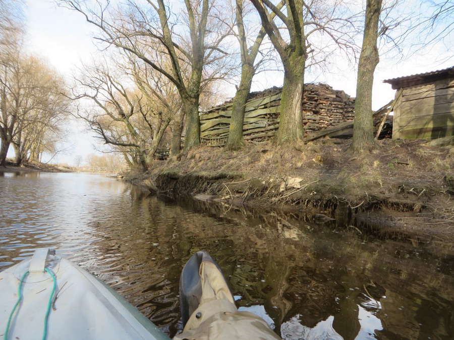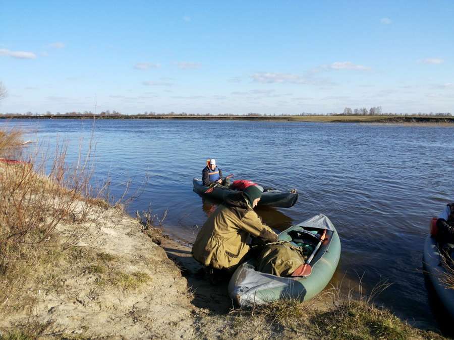 Но вскоре она закончилась, и мы вошли в огромную Горынь. Тут нам работы прибавилось, т.к. при поворотах, как на всех больших реках, приходилось грести от берега к берегу. За день мы делали пару остановок, разводили огонь и отдыхали. На прямых расстояниях наше судно вновь начало отставать. Баллоны вновь немного сдулись, а волны, подбадриваемые приличным встречным ветром, разыгрались, шлепали в днище и не давали нам скучать. В общем к последнему привалу в нашей лодке было необязательных литров двадцать речной воды и промокшие части тела - всё, что ниже пояса.