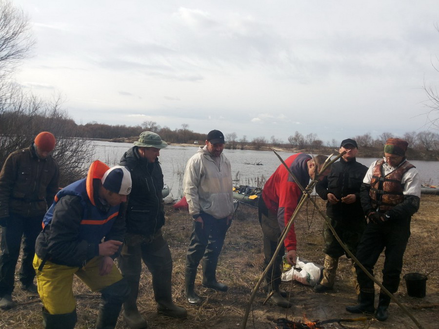 Слава Богу, что вскоре по правому борту показались огоньки – это наши товарищи стали лагерем в нужной точке (нужной точкой было устье Горыни, что не поймешь даже: лагерь был еще в Горыни или уже в Припяти) и уже разводили костёр. На берегу я с каждым шагом ощущал боль в замёрзших ступнях, но подойдя к костру неразумно переодеваться в сухую одежду сразу не стал - всё пытался отогреть кисти рук, застывшие как-бы в ухвате весла, меня буквально трясло от холода. Но поняв тщетность своих действий я стянул влажную байку с курткой и подставил своё тело горячему пламени костра. Какой это было блаженство! М-м-м-м-м…