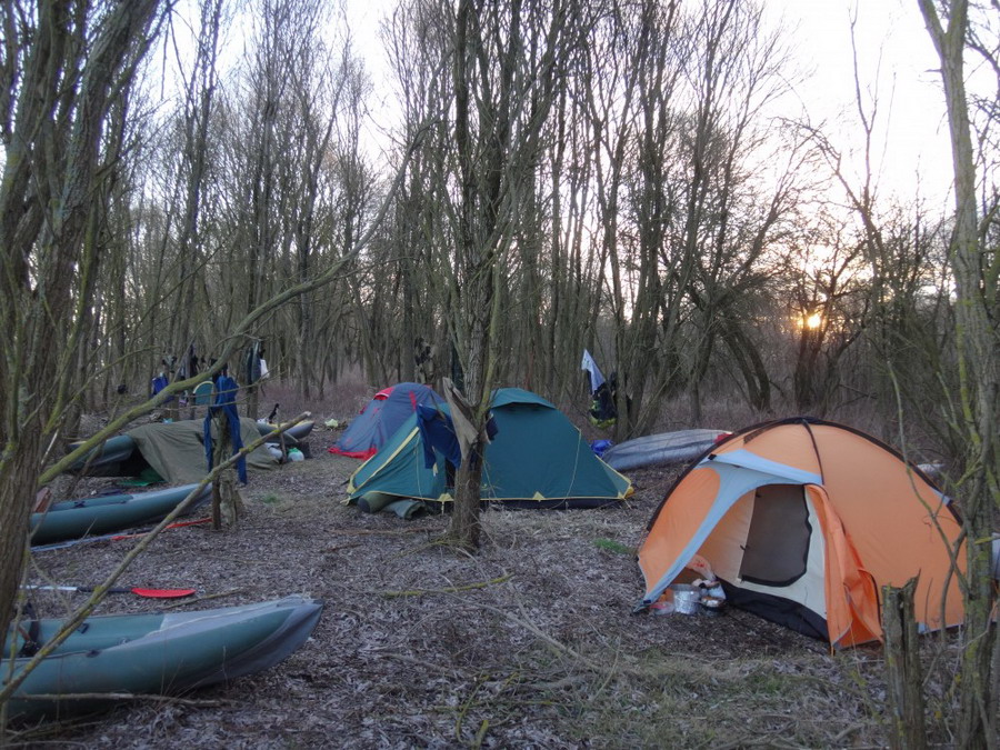 Как бы то ни было, вернувшись вновь через тоннели, мы свернули с основного русла в искусственно прокопанное прямое ответвление и через некоторое время в кромешной тьме упёрлись в тупик. Тут все завязли в грязи и особо жгуче ощутили усталость и холод. Наш суровый предводитель после небольшой разведки закомандовал перетаскивать байды через насыпь. Все с уставшим видом принялись за работу и вскоре за насыпью обнаружили сюрприз от Глаза – вместо воды нас ожидала прекрасная поляна с подходящим для костра подлеском. Вернее это был плоский луг, но верба росла, удобно охватывая нужное для лагеря пространство как бы кольцом.
