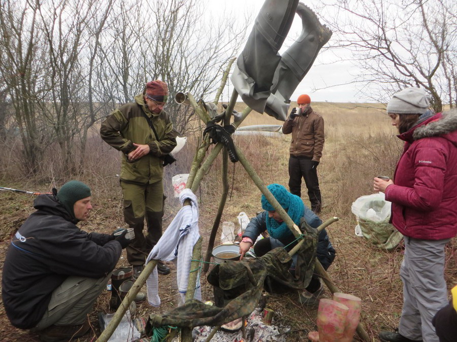 Утром не только у меня, но и ещё у кого-то, присутствовало впечатление, что снаружи моросит дождь и там всё мокрое. Но оказалось, что это совершенно не так, и стоит замечательная солнечная хоть и ветреная погода. В девять утра, когда я выполз из палатки, у костра суетился походный люд. Пили чай, завтракали. После стали подсушивать на костре мокрые вещи, я даже зашил разошедшиеся по шву свои походно-армейские штаны.