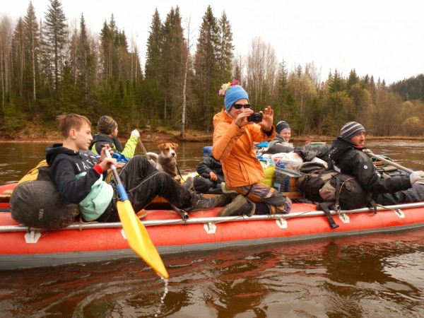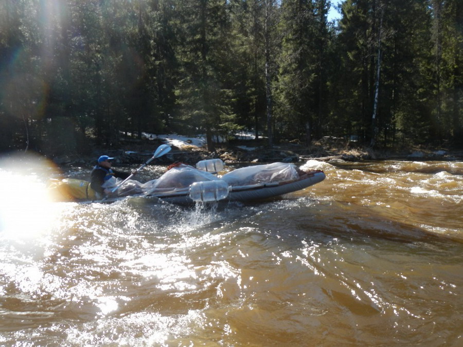 В деревне Усьва, точнее перед ней был порог. Бодрый для байдарки, но не представляющий интерес для катамарана. Вачека предусмотрительно закрыли в корзине и забрали на катамаран.