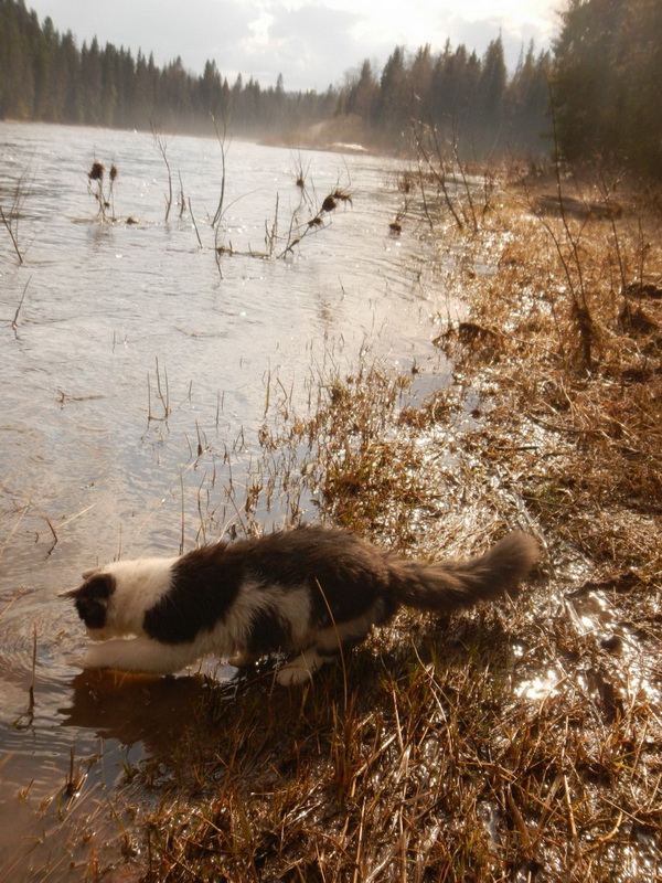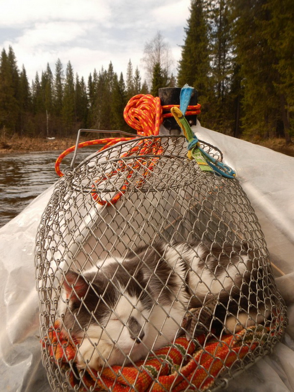 Вачека на порогах закрывали в специальной клетке и привязывали к катамарану. Уже мы порог прошли и клетку открыли. Максим-Летчик-Пенсионер подъехал на своей щуке близко и спровоцировал животное. Несчастный кот бросился в воду и поплыл к хозяину.