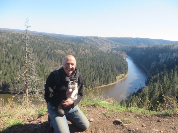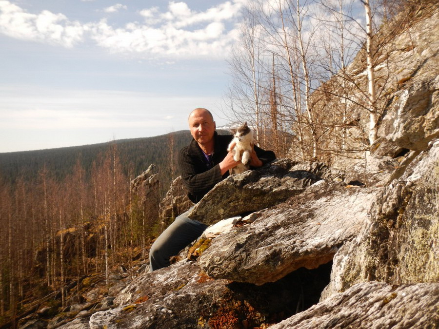 Погода и на следующий день была хорошей. Выехали. Через километров восемь нашелся Максим-Летчик-Пенсионер. Стоял он тоже на правом берегу на хоть и загаженной, но уютной стоянке. Чай кипятил в кружке. Пока ожидал нас, ходил на высокий берег, где были скальные выходы. Так он совершенно случайно наткнулся на знаменитый Усьвинский камень - памятник природы Еранина Деревня. Высокие скалолазные навыки продемонстрировал кот, который не очень то и хотел обратно возвращаться.