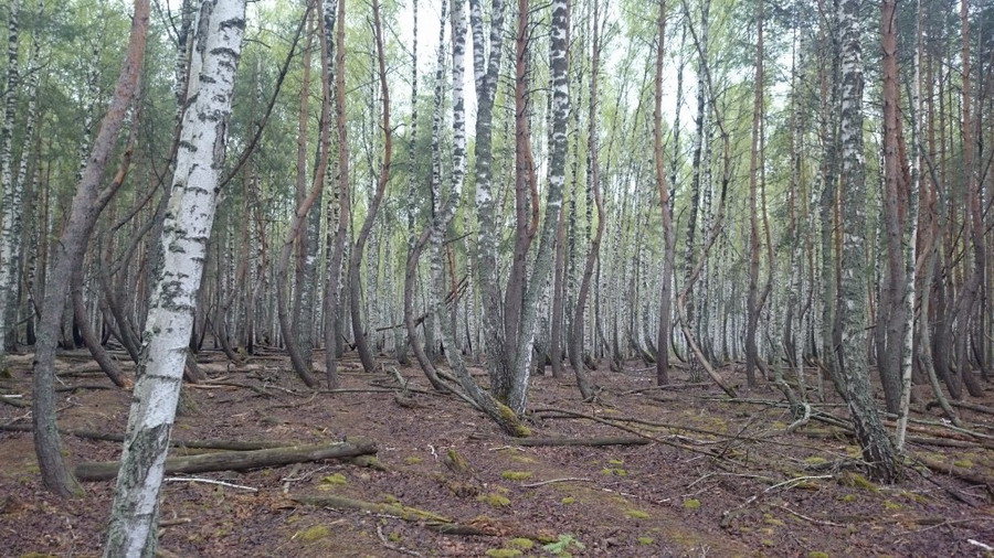 Неизвестная сила лет двадцать пять назад выгнула в основном сосны в северном направлении. Я предварительно накануне посмотрел ряд фильмов про этот пьяный лес. Наиболее вразумительное объяснение тому - несколько сверхдождливых лет в конце восьмидесятых и соскальзывание верхних слоев грунта относительно более глубоких. Но местность плоская и не совсем тоже укладывается, куда тут соскальзывать.