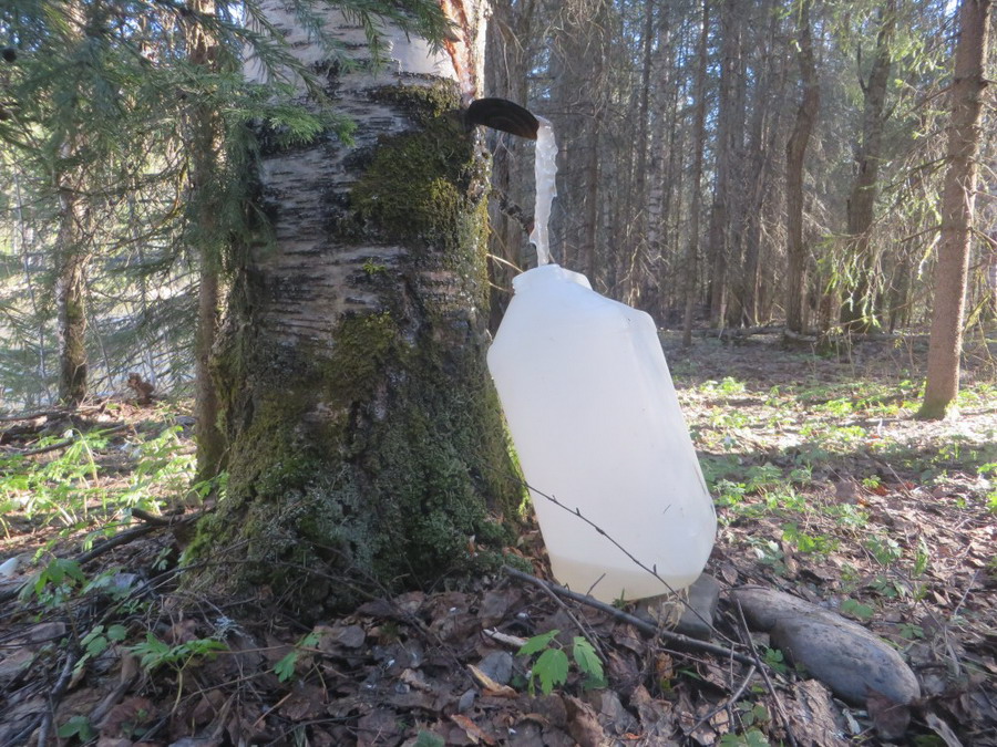 Ночью заморозки. С вечера традиционно подковали березы, промышляя соком. Сок замерз в сосульку.
