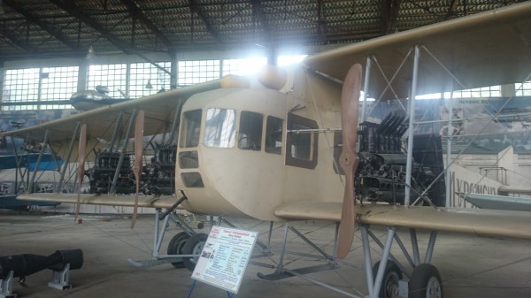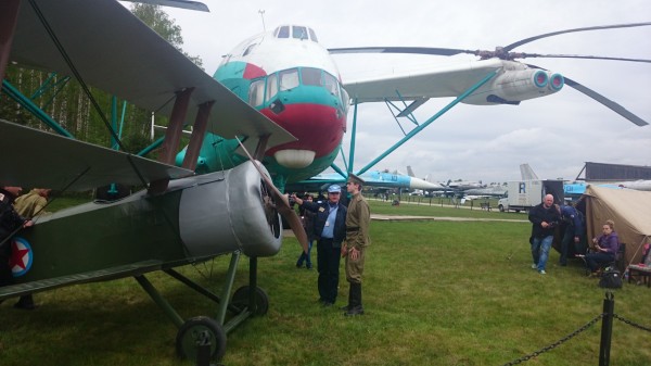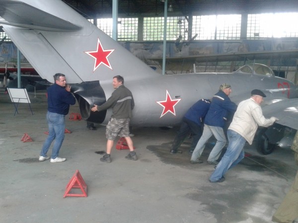 По дорожке мимо реактивных самолетов мы дошли до самого большого ангара. И вдруг оказались здесь как нельзя кстати. Сотрудники музея – дядьки около пенсионного возраста - очень обрадовались. Семь человек мы отлично подходили как рабочая сила. Требовалось закатить к месту съемок самолет «этажерку» столетней давности. Для этого сперва кантовали и отодвинули Миг-19.