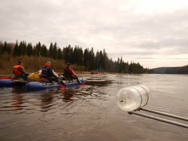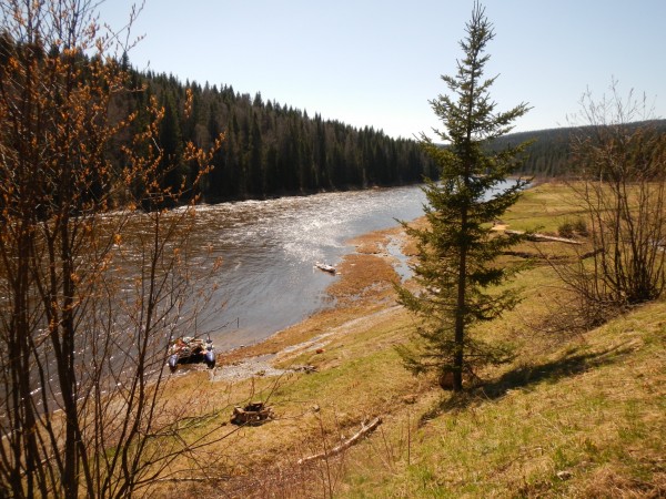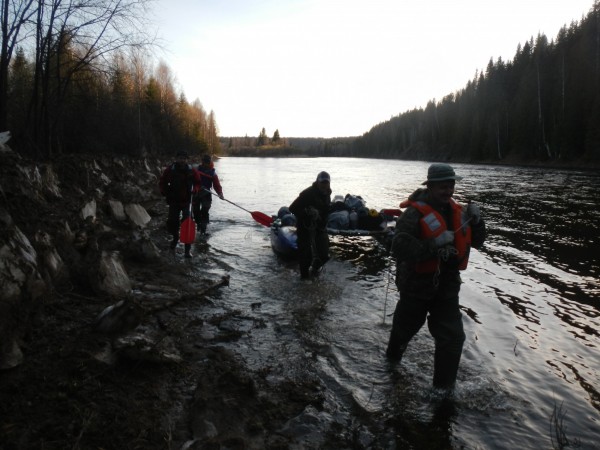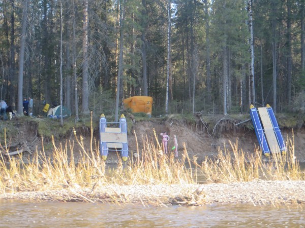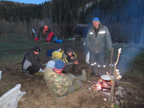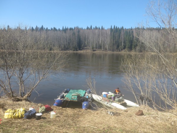 Одну из стоянок организовали в сравнительно неудобном месте. Катамараны пришлось возвращать сколько то против течения бечевой. Выход на берег был загроможден льдинами.
