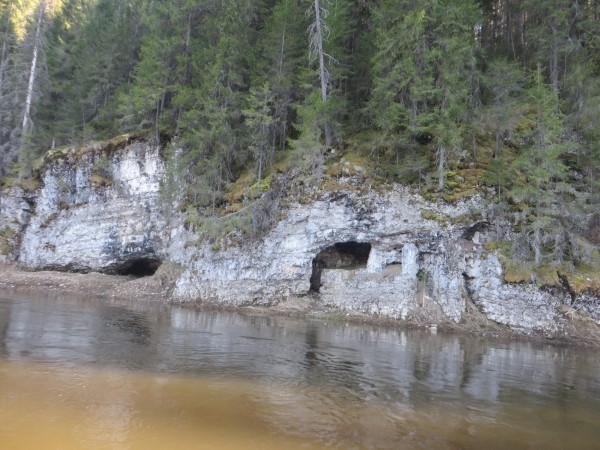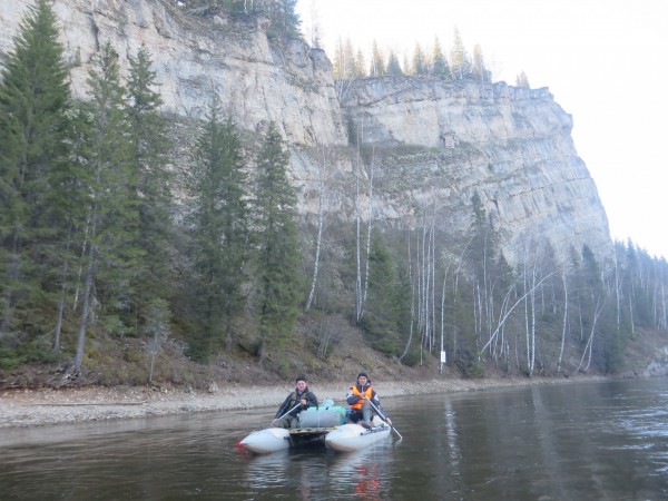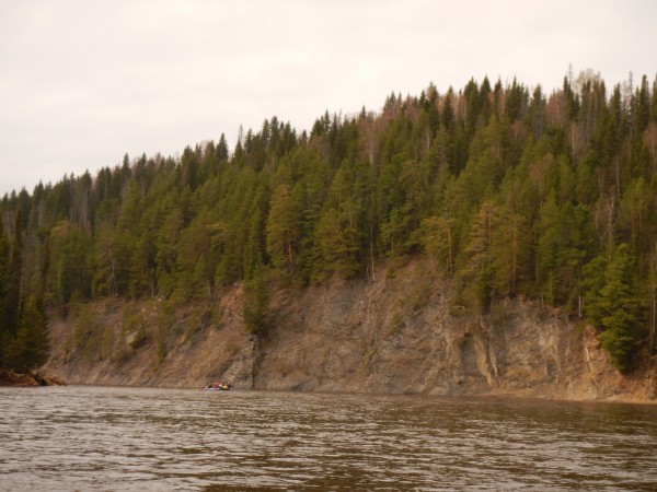 В Усьву приезжают не только катамаранщики. Есть тут что-то типа дома отдыха. По берегу ходили и просто ходоки с рюкзаками. В основном они направлялись на ближайшую скалу 120 метрвой высоты обрыв - Усьвинские Столбы.