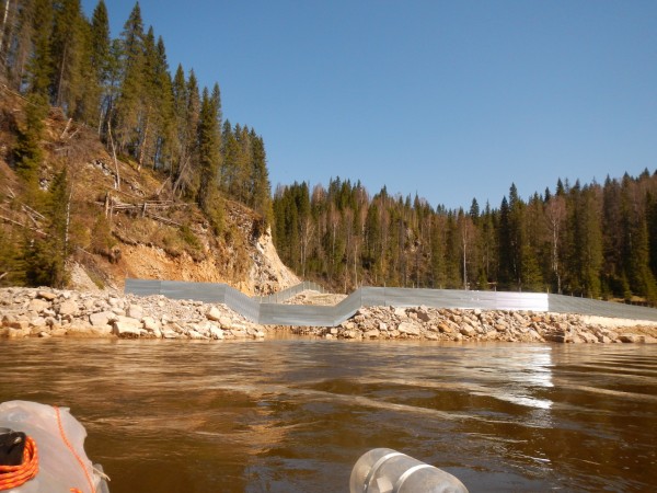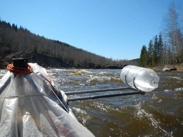 Подле места ночевки Максима-Летчика-Пенсионера имелся обелиск погибшим на пороге туристам. Мы уже прошли несколько перекатов, дальше был каскад в несколько порогов. Максим-Летчик-Пенсионер подготовил свою Щуку к прохождению подобных. Придал жесткости за счет каркаса труб. Сделал для кота специальную комнату шалаш и более того для придачи боковой устойчивости изобрел поперечные стабилизаторы с резервуарами в виде пластиковых емкостей в 50 литров.