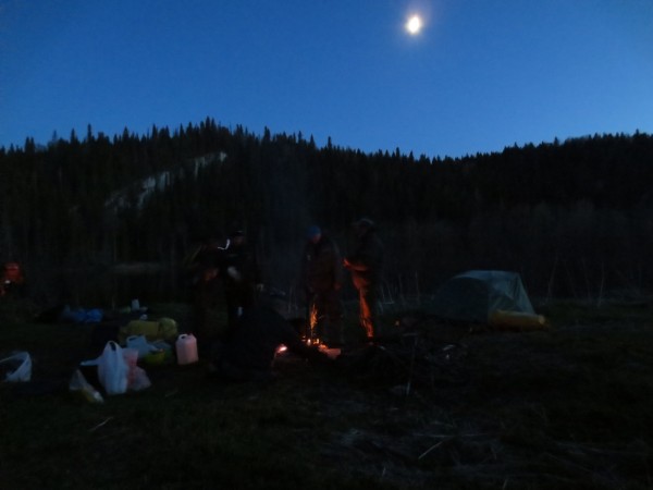 Максим-Летчик-Пенсионер из-за своей индивидуальности мало пригоден для хождения в группе. Он сегодня упер вперед, пока мы ремонтировали катамаран-двойку, что его так и не смогли догнать. Без утвари, но с едой. В общем дело было близко к сумеркам. Для стоянки правый берег был вполне подходящим. Вечер с ярким костром был душевен.