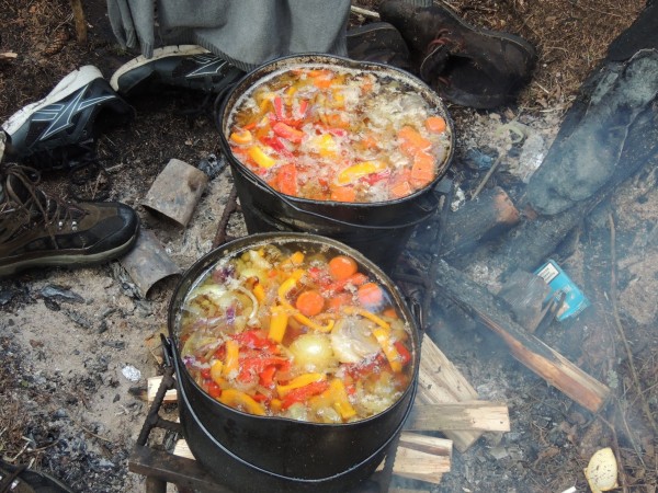 Приблизившись к выходу из протоки, мы увидели явную примету остановки: маяк – наклоненное дерево и несколько байдарок на берегу, Алеся с Сашей были на берегу, уже вовсю хозяйничали: языки костра подогревали маленький походный чайник, после назначения нашего экипажа на дежурство, помощников нашлось очень много, мужчин уговаривать не приходилось, дрова бензопилой пилились быстро, костер разгорался до неприличия, готовить попросили Андрея Потапова: на Ольманских болотах, ему, каким-то образом, удалось сварить чудо-супчик, требовалось закрепить результат повтором.