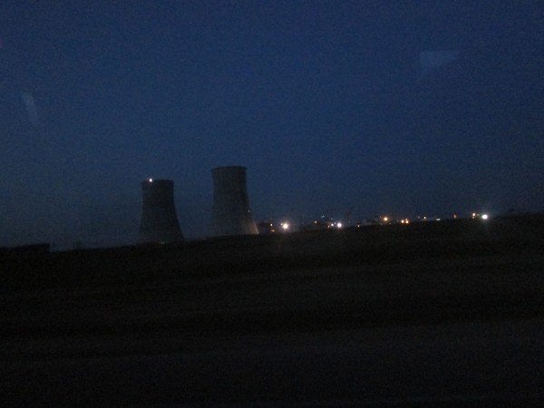 Бусик увозил компанию в ночь, ярко освещая путь фарами, мы же, плотно упаковавшись, сидели в бусе и рассматривали Островецкую АЭС.