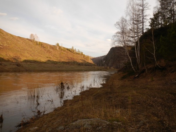Глаз вышел на воздух. Погода пасмурная и влажная. Сходить к реке было здесь с высокой насыпи крайне неудобно. Повстречавшийся лесник сообщил, что за последнюю неделю вода сошла более чем на метр. Визуально Большой Инзер, однако, еще оставался довольно пухлым, и сохранил приличную скорость течения. Мы вполне успевали, чтобы по нему спуститься. Вода вопреки Сакмаре не коричневая, а как бы бело-серая: совсем здесь не такая. Не так далеко мы отъехали от Сакмары, еще меньше от Сибая, но здесь уже было все по-другому. Не гранитно-степные берега, а с двух сторон лес. Резко поменялась природная зона.