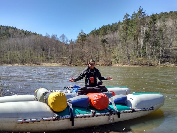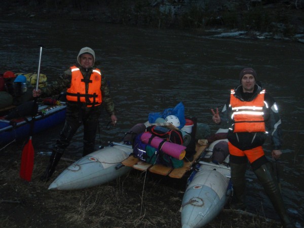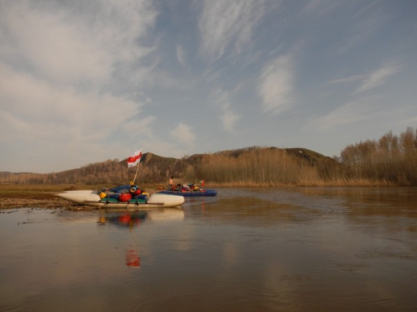 Съехали ниже в деревню. Рядом собирали еще несколько катамаранов. Место было почти общественное. Одна группа даже считай детская. Витя Гетюк развернул белорусский флаг. Показавшиеся из буса беларусы, начали нецензурно реветь! Флаг пришлось стремительно убрать. «Руссияновых» уложили спать. Катамараны собрали за три часа. Машину оставили под присмотр местных жителей здесь же. Снарядили и загрузили суда еще за час. Выехали на вечерней зорьке. Пьяные сколько-то к тому моменту протрезвели и уже не выли. Глаз под вечер накатил (днем в этом походе был самозапрет). Уже не реагировал так остро на руссияновщину (руссияновщины теперь не было). Гребли дружно.