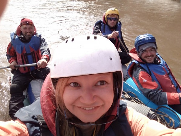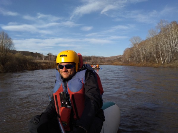 Наша группа была, наверное, самая трезвая сегодня, да и на следующий день, на этой реке. В одной из групп был дедушка, который ехал и, что не свойственно его возрасту, голосил. Примерно, как раньше Руся (уволен в конце 16-ого). Ветра не было. Река протекает в высоких берегах, а иной раз и в скальных мешках. От этого вопли казались еще более шумны и гулки!