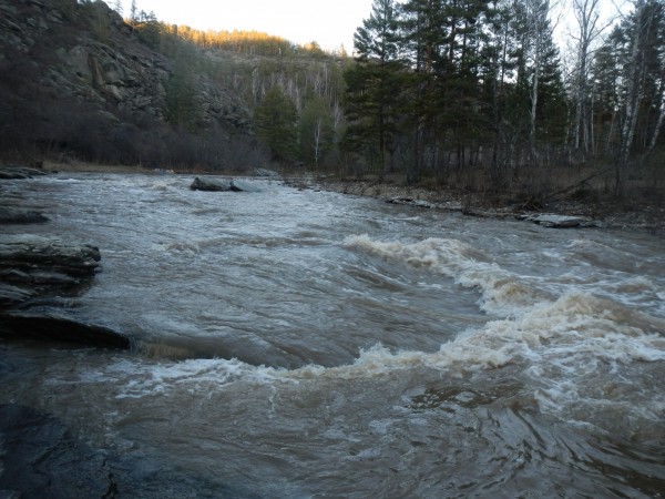 Шивера Сарышта на спадающей воде, - ничего собой выдающегося не представляет, только надо смотреть, чтобы ничего не зацепить. До камней запас уже оставался не более 30см. Шивера когда то была одноименным порогом. По Большому Инзеру когда-то сплавляли лес и порог взорвали. Лет пятьдесят назад или более…