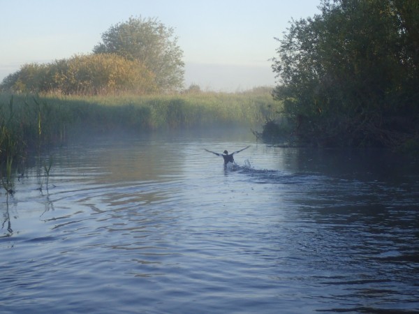 Вскоре вспугнули неказистую утку Чомгу. Туша грузная с гротескной маленькой головой. В брачный период (весной) на этой голове в виде ушей оттопыриваются перья. Утка шумная с противным голосом. Летает неуклюже и неохотно, стартует как и в этот раз только с воды. Но если надо, летун она неплохой. До недавних пор рыбохозяйственными службами поголовье чомги активно уничтожалось. Птица считалась злейшим пожирателем рыбной молоди.