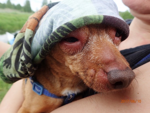 Одним из участников похода была комнатная собачка - оказалась очень уязвима к природным воздействиям - кто-то её покусал